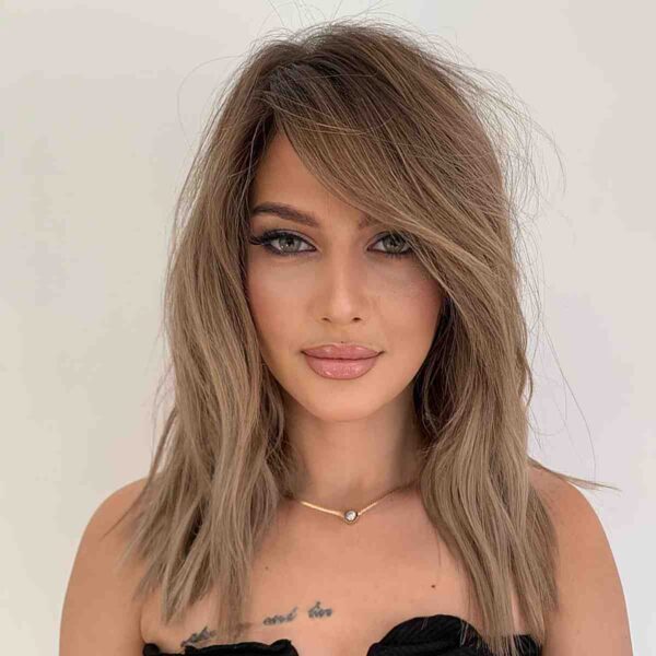 Say farewell to brassy locks with sandy ash blonde hair featuring textured ends. Transform your lifeless locks into vibrant and stunning strands. Ash tones appear more subtle compared to warm tones. They do not reflect the light as much. To keep yellow tones at bay, use purple shampoo once a week.