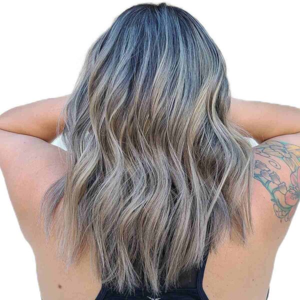 I refer to this as a silver foliage because I utilized both techniques, foils, and balayage, to achieve the desired lightness for a silver hue. Initially, this blonde hair color took 6+ months, and I began at levels 6-7. It’s crucial not to overload your hair beyond its capacity when aiming for this color. To reach a silver tone, you have to remove all pigment from your hair, which makes it susceptible and in need of treatments and regular upkeep.