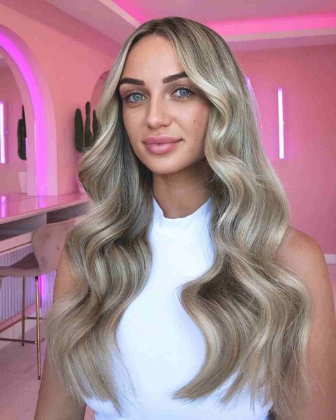 A little on the beige side – these sophisticated ash blonde highlights with wavy layered hair with soft babylights are a delight to the eye!