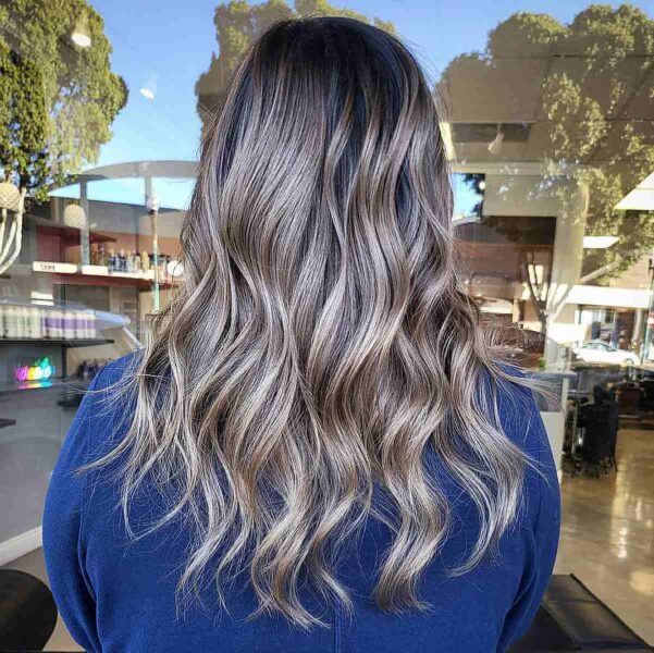 Opting for deep brunette shadow roots creates the illusion of a delicate ash blonde ombre with this medium-length, slightly curved straight hair. Those ashy babylights also assist in transitioning the colors seamlessly.