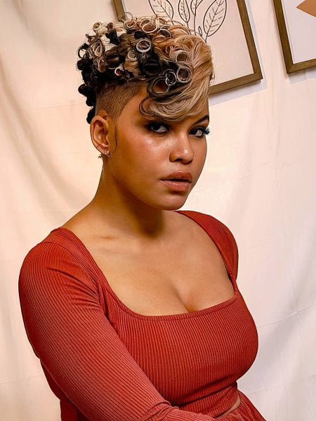 A caramel blonde undercut is an elegant way to highlight the fullness and texture of your natural curls. The tone of blonde complements women with a warm skin tone. Enhancing this natural undercut with a shaved design adds a bold touch.