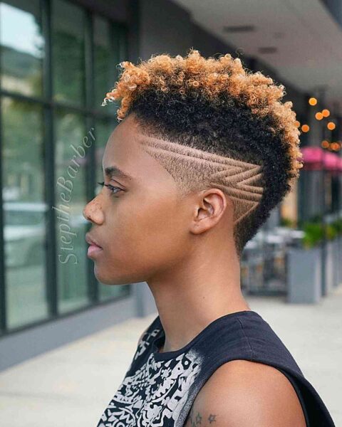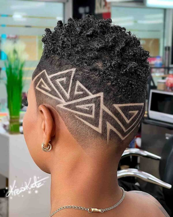 This chic natural hairstyle isn’t the typical tapered cut you often encounter. The shaved designs on either side enhance its bold and captivating appeal.