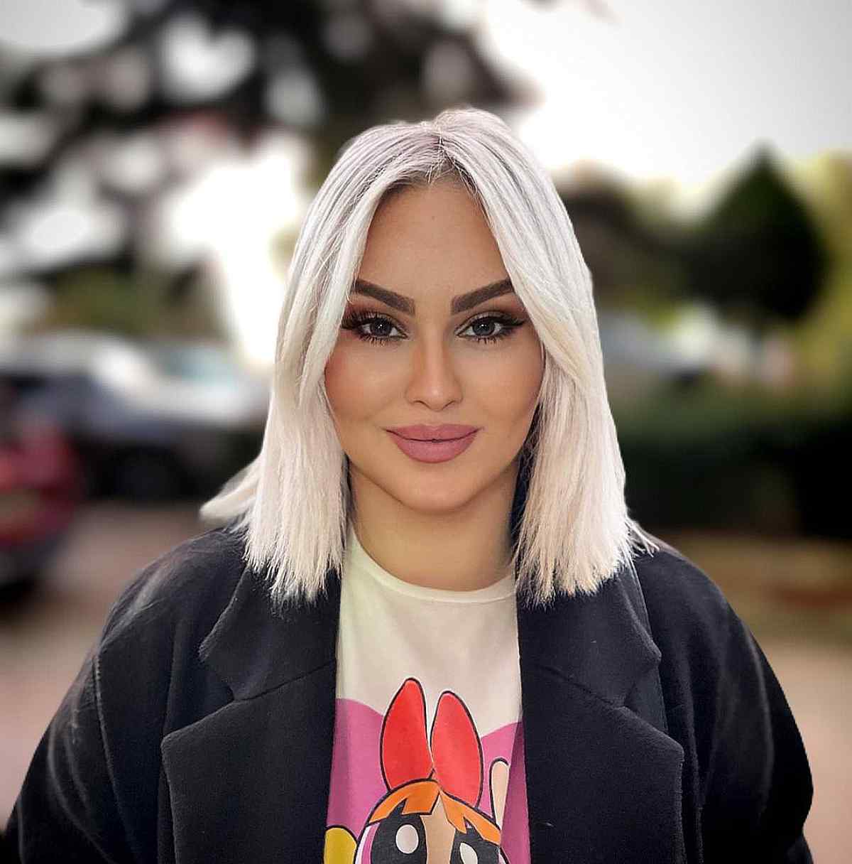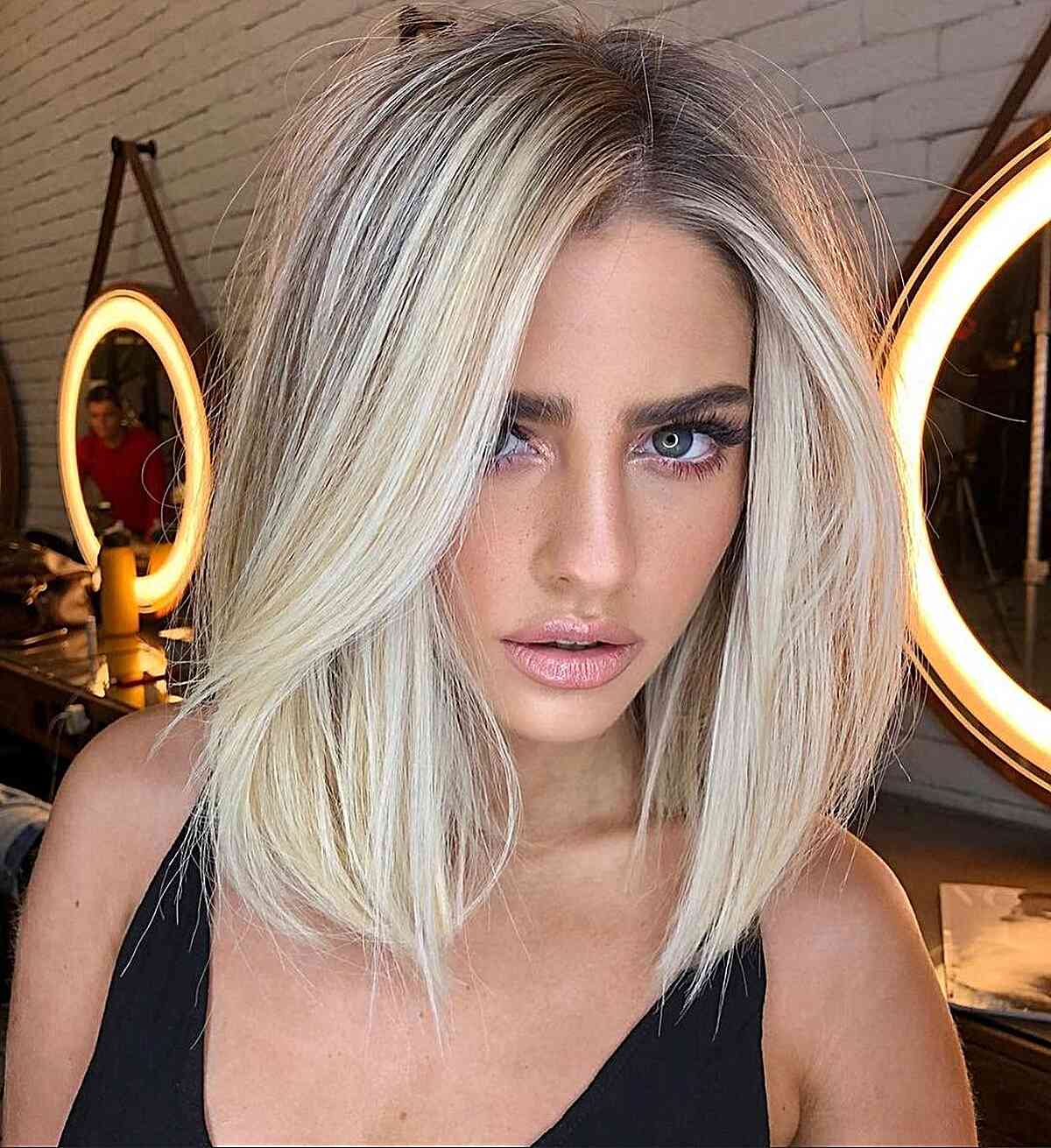 A blunt lob cut in a soft white-blonde shade is a chic style. This length of the lob is highly versatile, as you can wear it styled up or down. For a bob vibe, wear it straight. Discuss with your stylist to choose the best length that complements your hair texture.