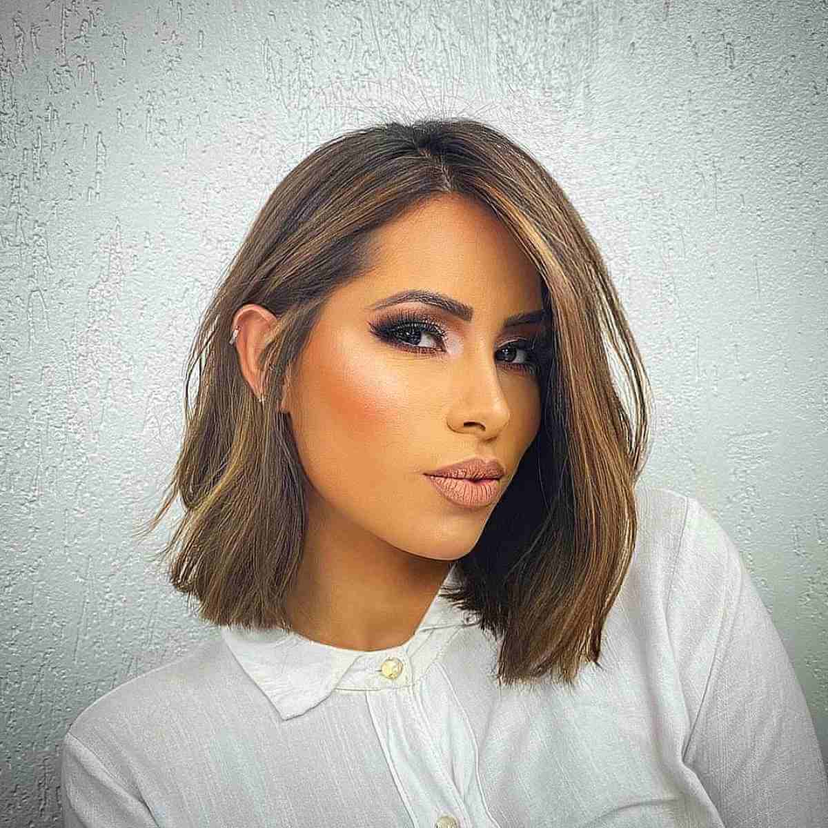 Show off a sleek blunt lob and achieve that tidy, timeless look. A chop like this is ideal for women with a round or oval face shape. It frames the face and establishes harmony. This cut demands minimal styling when heading out, too!