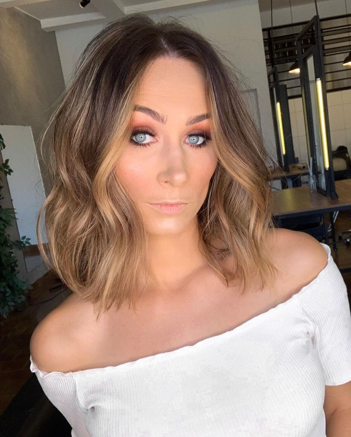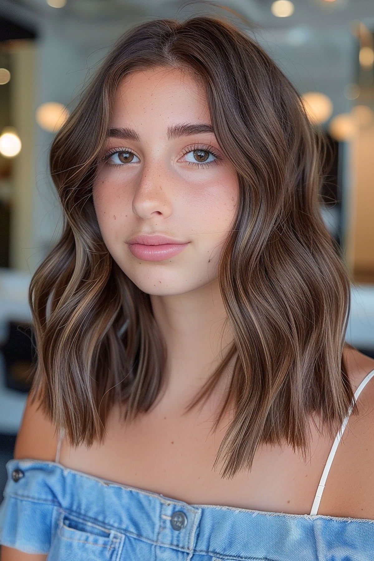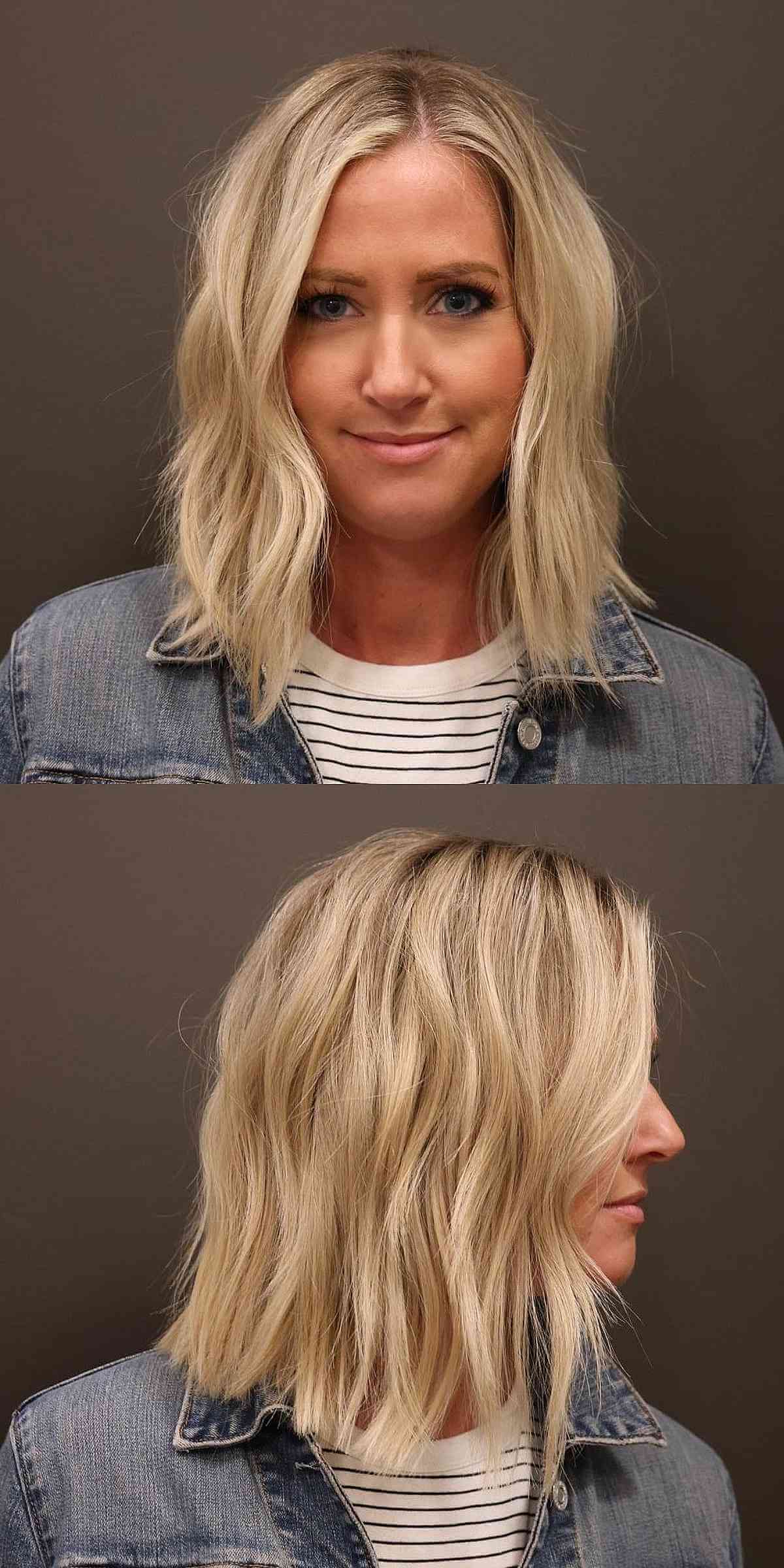 This tousled bob with a center part is ideal for women looking to refresh their style without making a significant change. A shoulder-length wavy lob provides a “cool, chic girl” appeal.