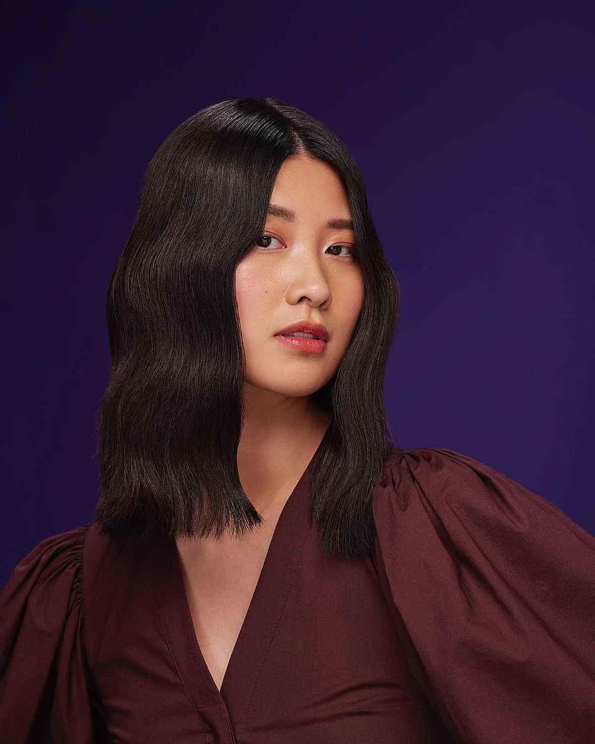 This shoulder-length sleek long blunt bob is made even more stunning by its vibrant color. The foilayage technique enhances the freshness of a classic one-length blunt bob. For added volume, consult your stylist about tape-in extensions.