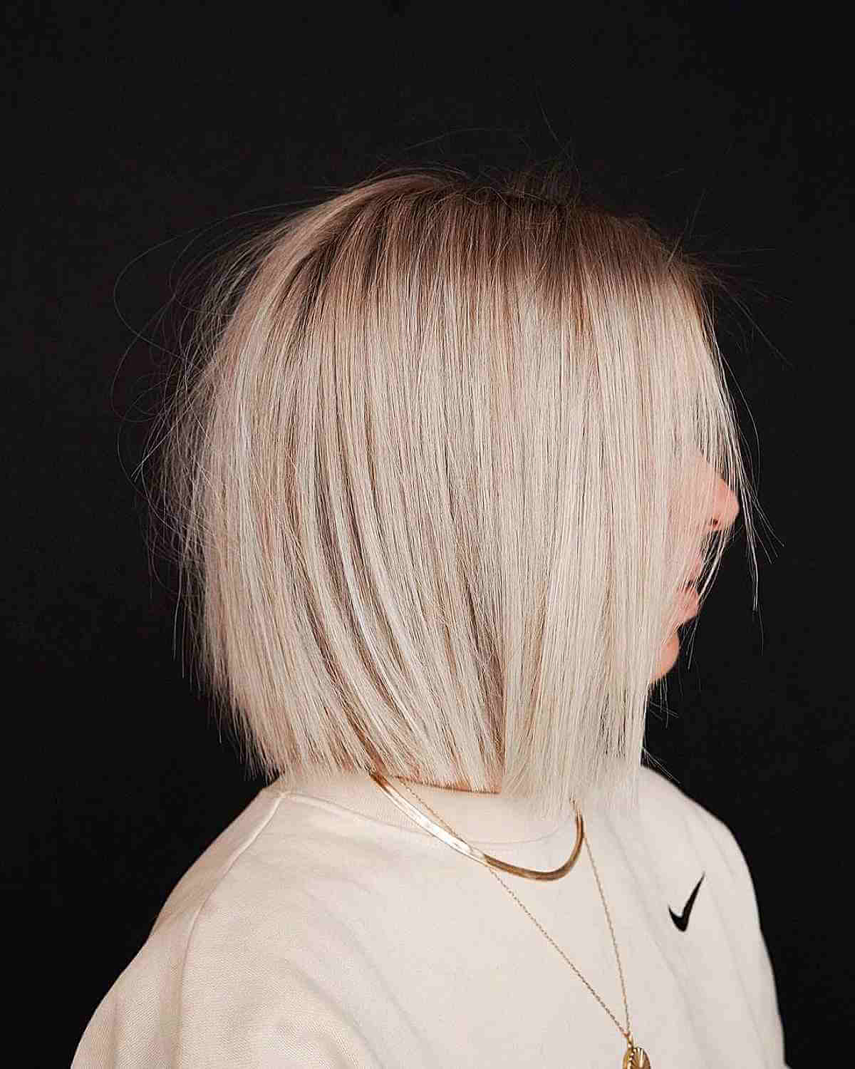 A light blonde long bob with darker roots is ideal for women seeking a sophisticated hairstyle with a contemporary twist. Maintaining darker roots with your blonde will not only enhance depth and dimension to your hair, but it will also allow for a more natural growth process if you naturally have darker hair. This shadow root can be beautifully blended into your blonde hair so you can extend the time between salon visits.