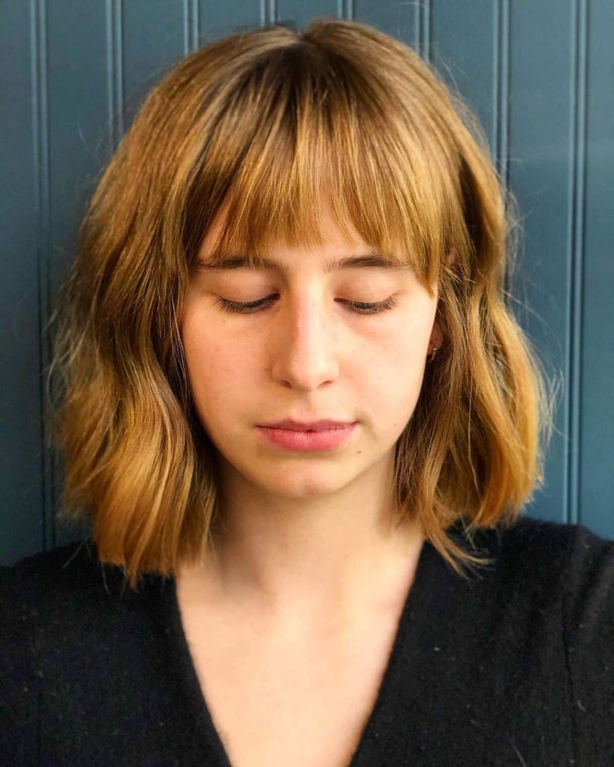 Add waves to a lob with straight bangs to achieve a chic, more refined look. Let the hair shine even brighter by painting it warm blonde.