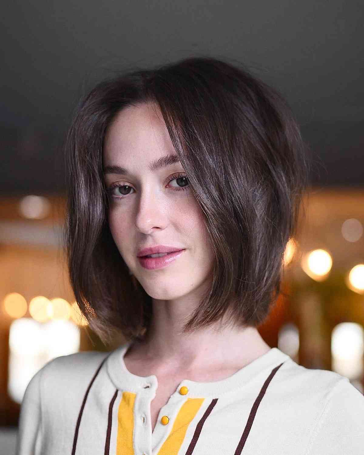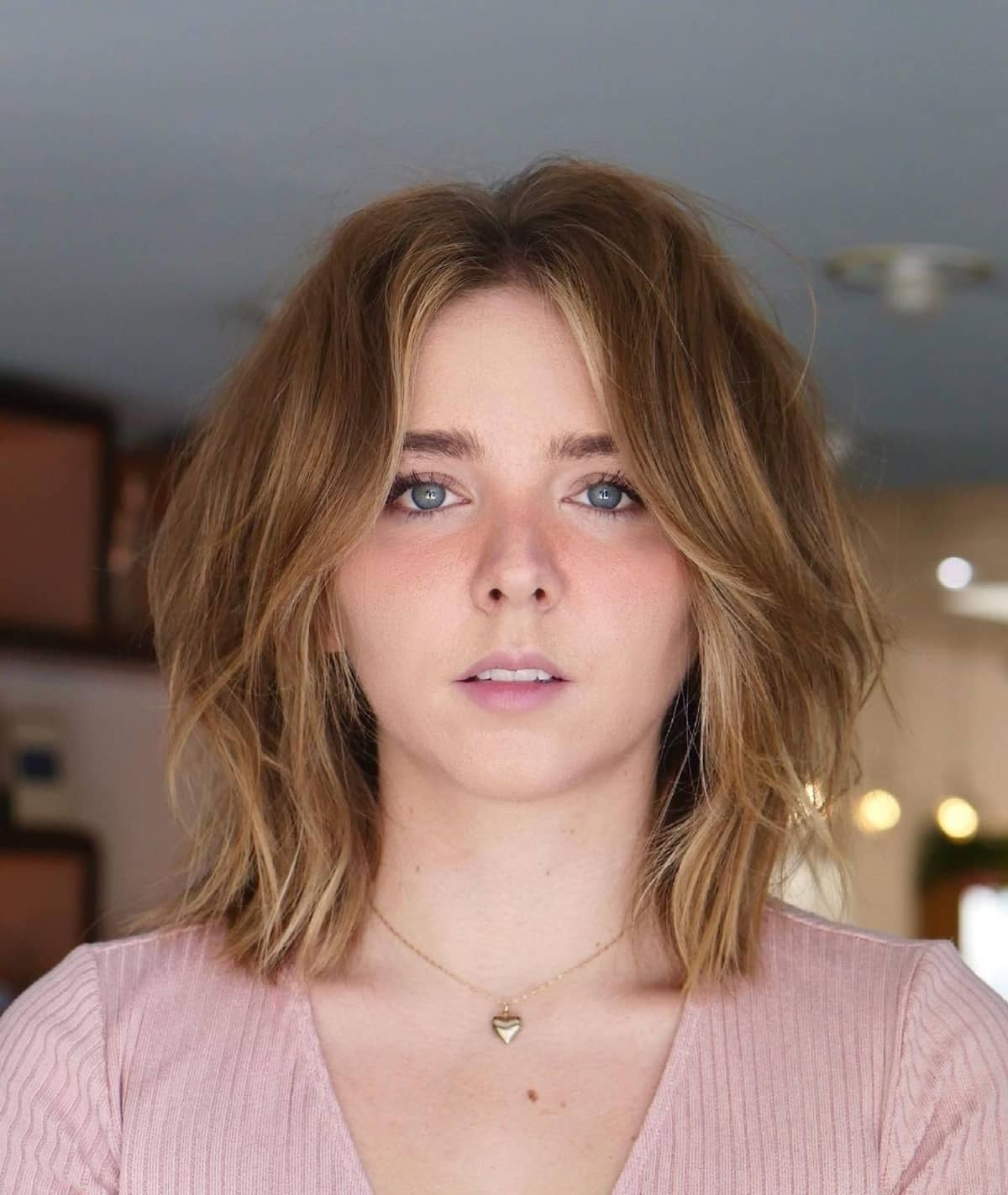 Opt for a stylish textured blunt bob that feels contemporary and beautiful. With its length grazing the shoulders, this cut enhances a round face shape. It beautifully frames the face when worn with a center part.