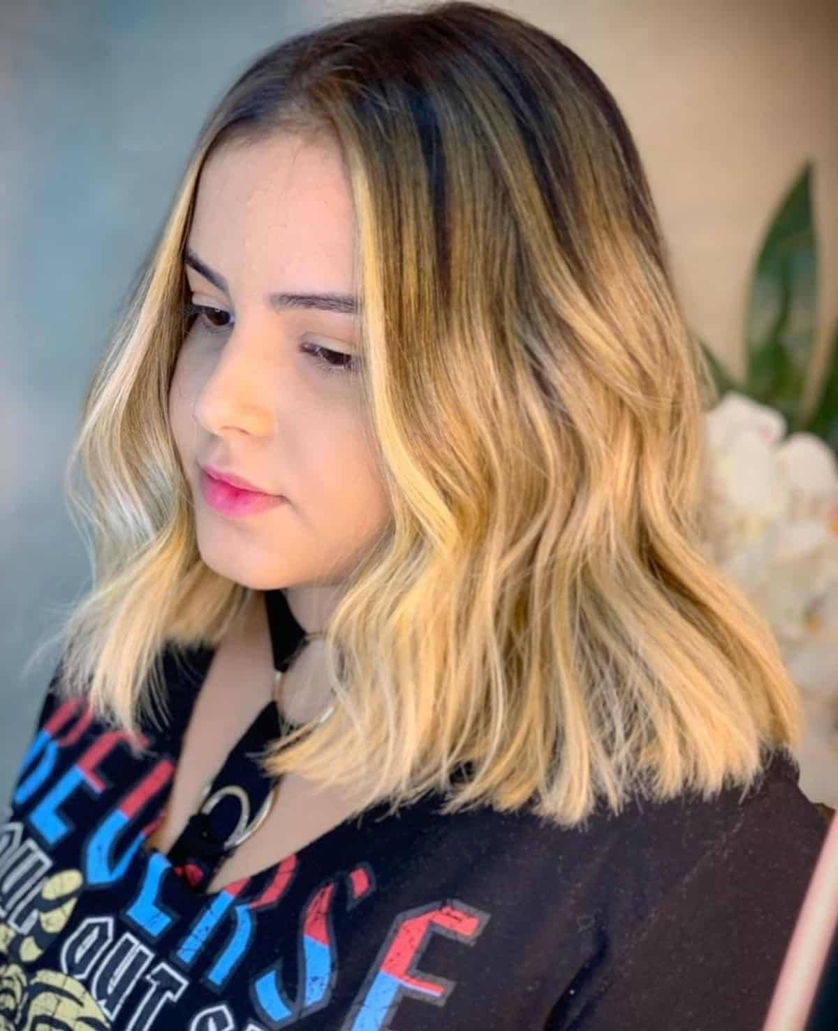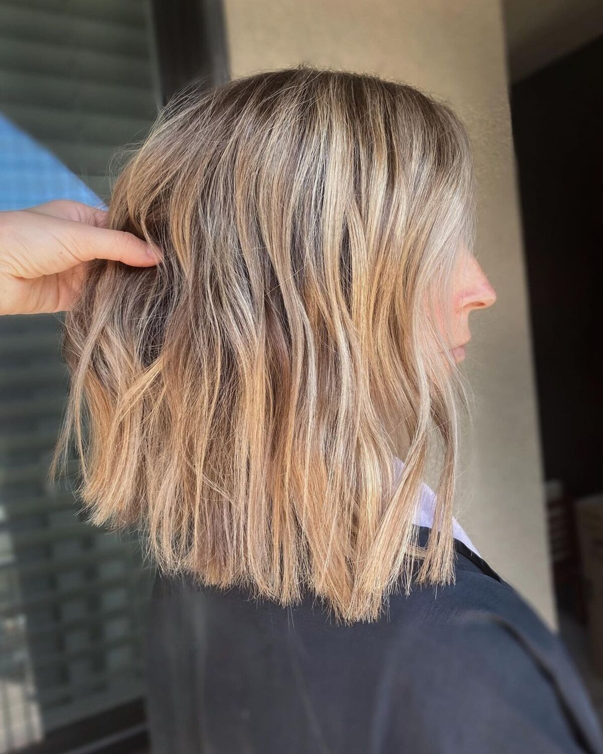 The shoulder-length blunt cut in sun-kissed blonde is a soft and feminine hairstyle. The medium length is ideal for those hesitant about having short hair. A long blunt bob haircut is quite versatile, too. You can wear it wavy or straight, even easily pulled up into a ponytail. The sun-kissed blonde highlights accentuate the style, giving it beautiful dimension and depth. No worries this type of haircut suits all hair types and textures.