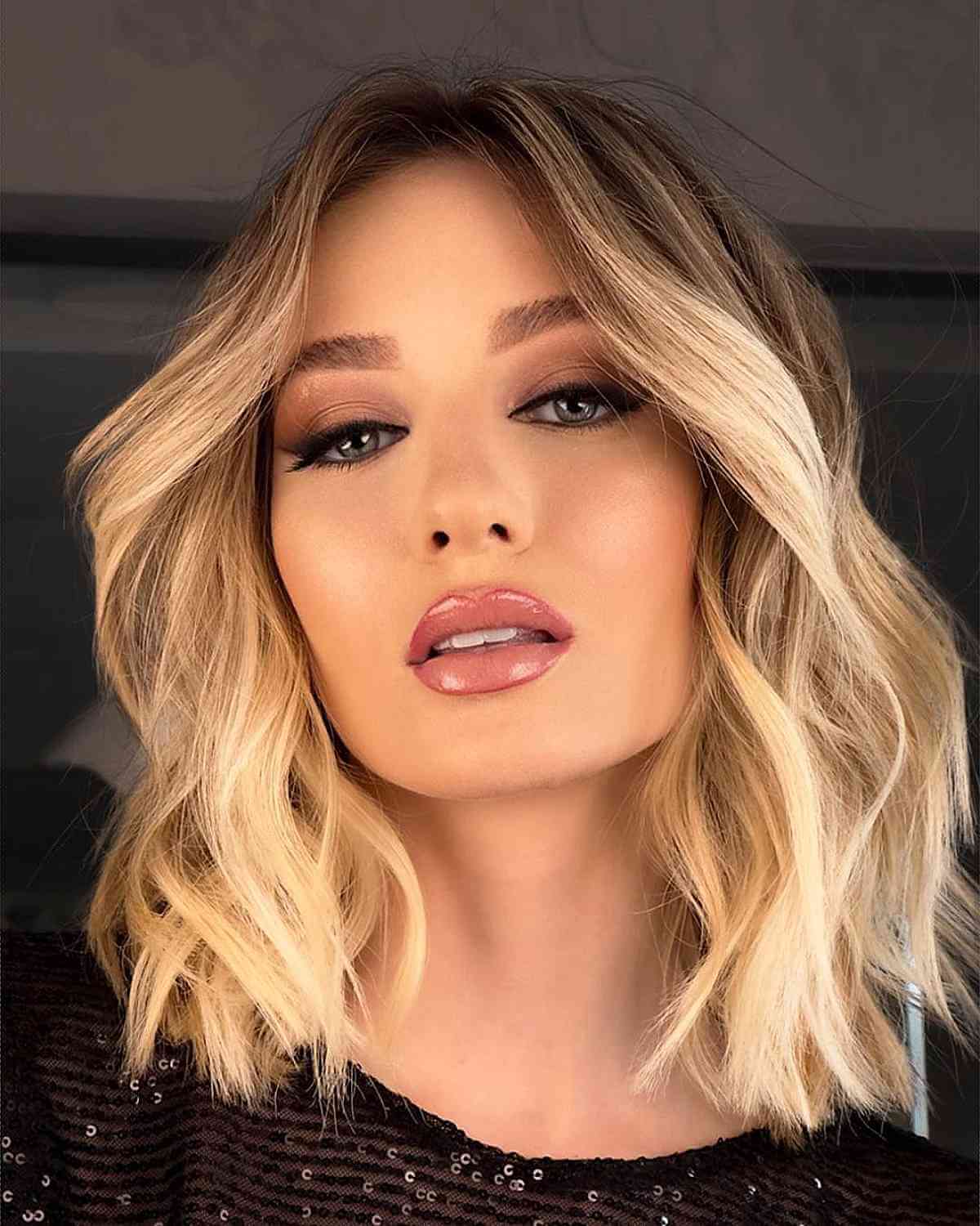 If you desire a sleek and contemporary appearance, your ideal choice is the fashionable soft golden blunt lob without fringe and middle part. Dedicate time to perfecting this style – it will be worthwhile! With its length just below the shoulders, this cut suits all face shapes and hair textures. This low-maintenance style will still need regular trims to maintain a polished look.