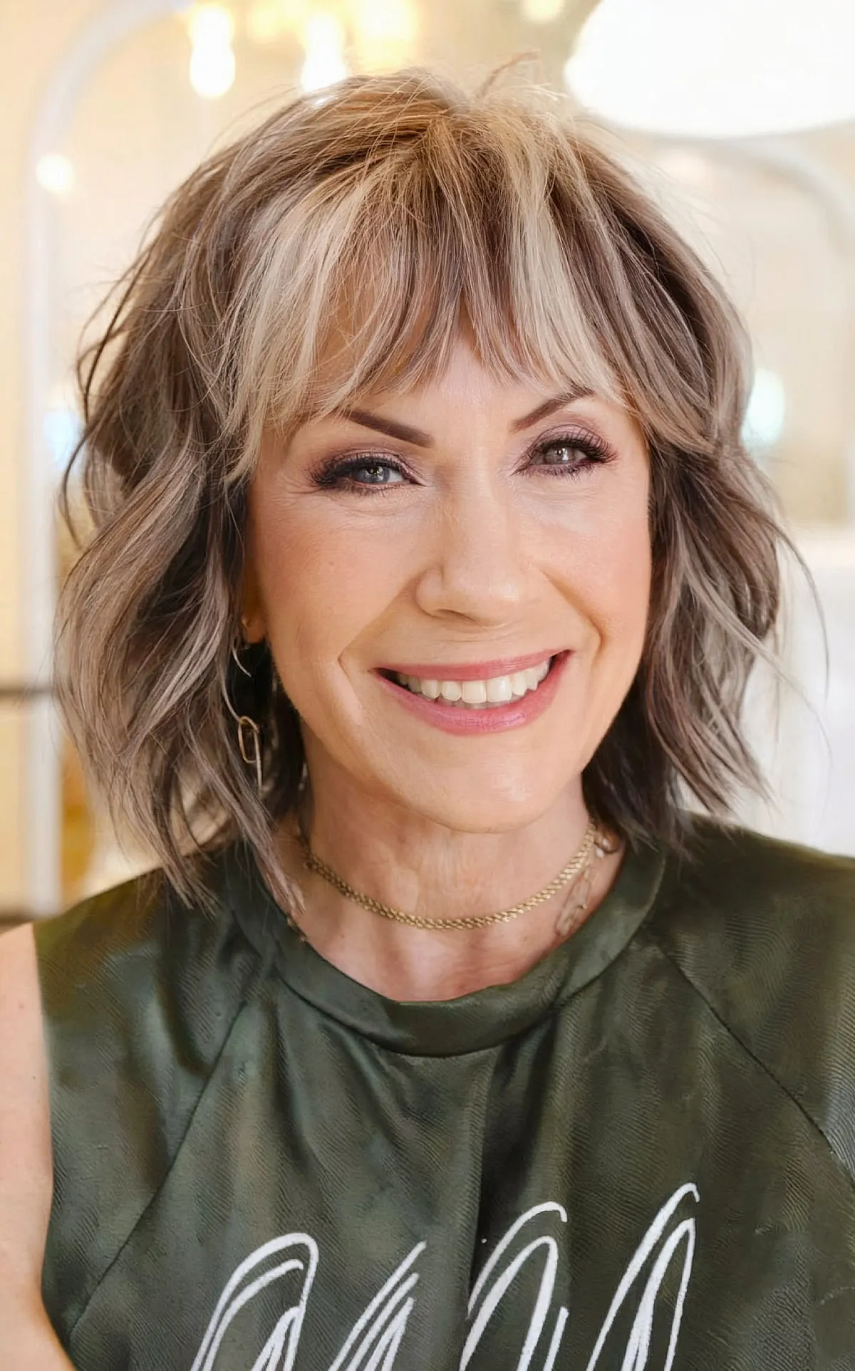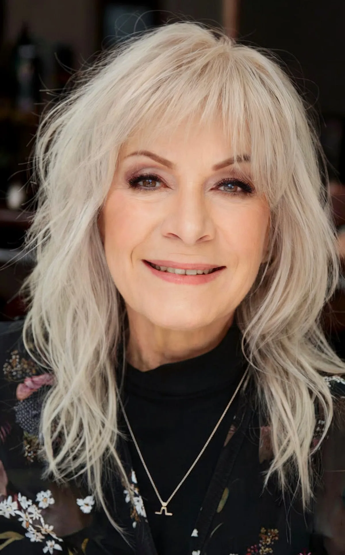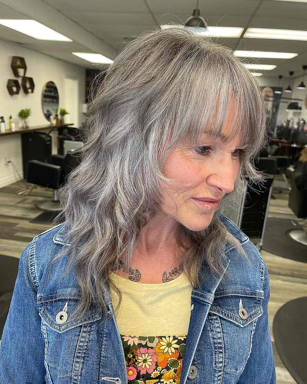 A medium-length shag in salt-and-pepper tones with bangs is perfect for mature women who enjoy experimenting with their hair. One of the best features of this mid-length hairstyle is its versatility. It can be styled curly, straight, or with your natural texture and still radiate elegance and charm.