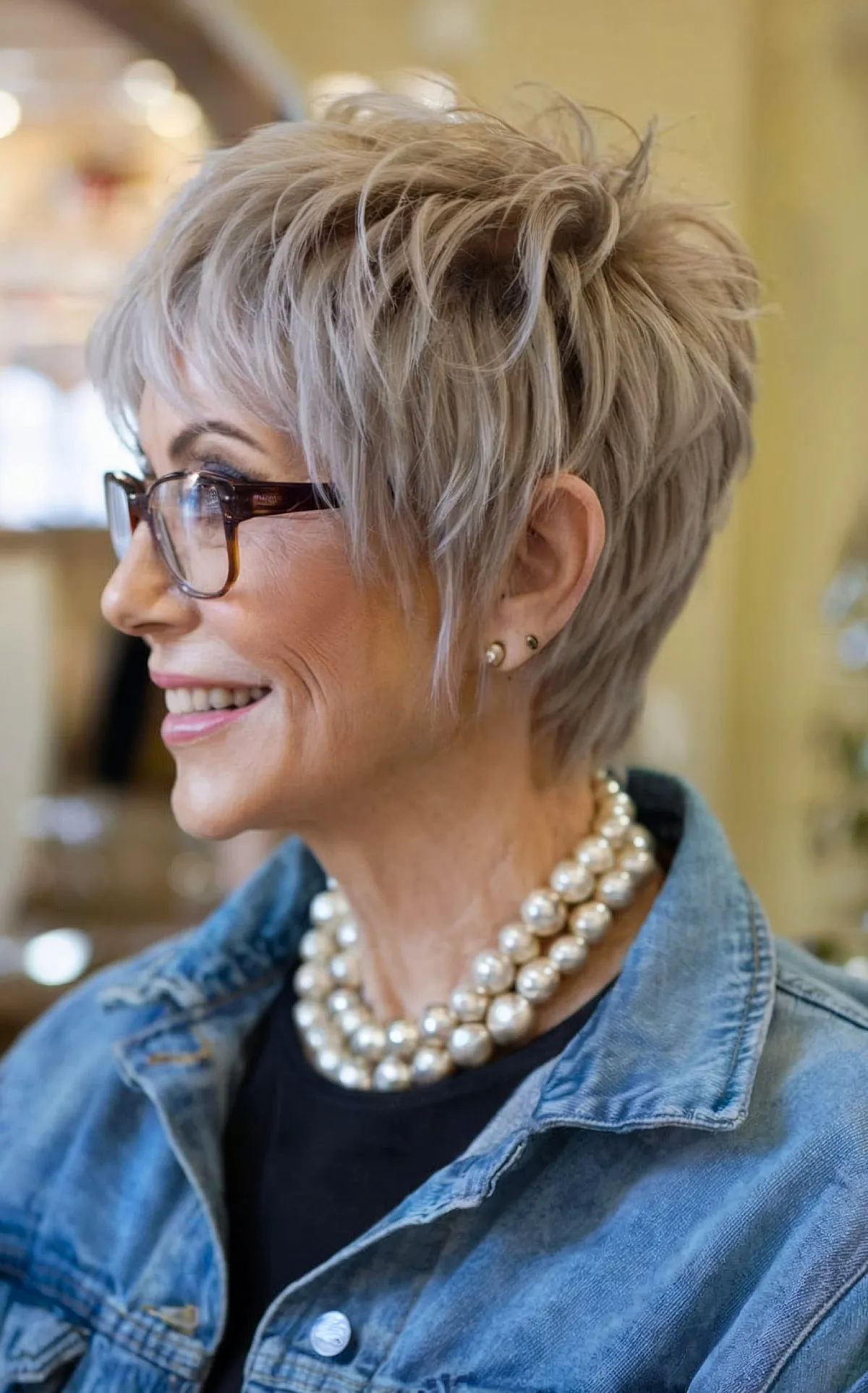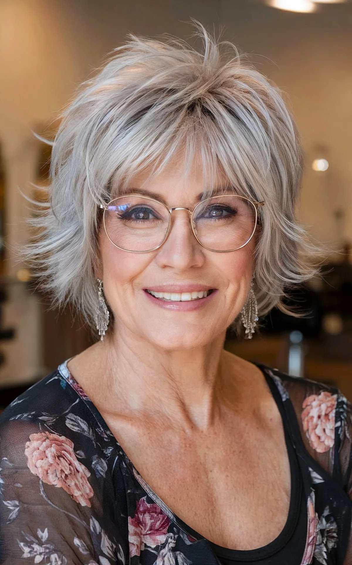 Chic Shag Hairstyle for Women Over 60 with Bangs and Glasses