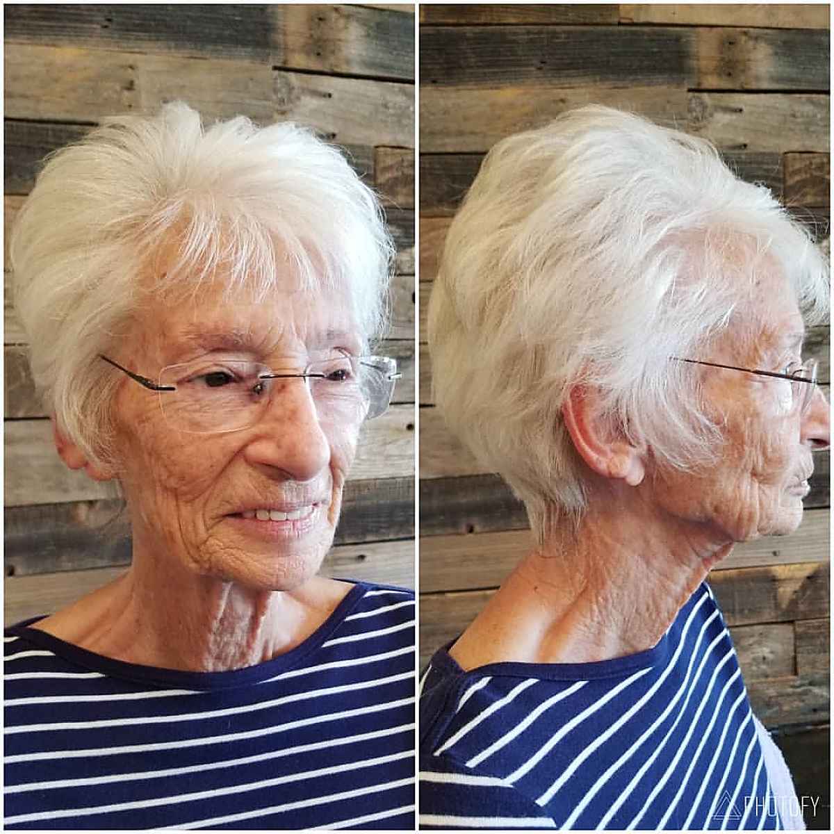An effortlessly chic shaggy pixie with bangs for women over 70 is a fantastic choice. The shag style helps create volume and height on fine or thinning hair. Style with a round brush, or curling iron, and a workable hairspray.