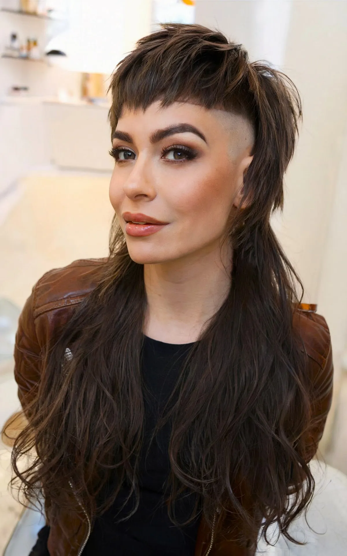 Achieve an effortless mullet shaggy hairstyle with bangs if you’re looking for a bold, low-maintenance look. While natural curly or wavy textures will provide more styling convenience, other hair types can still embrace this style with minimal effort. Consider using a volumizing mousse and a diffuser to create that scrunch-and-go effect.