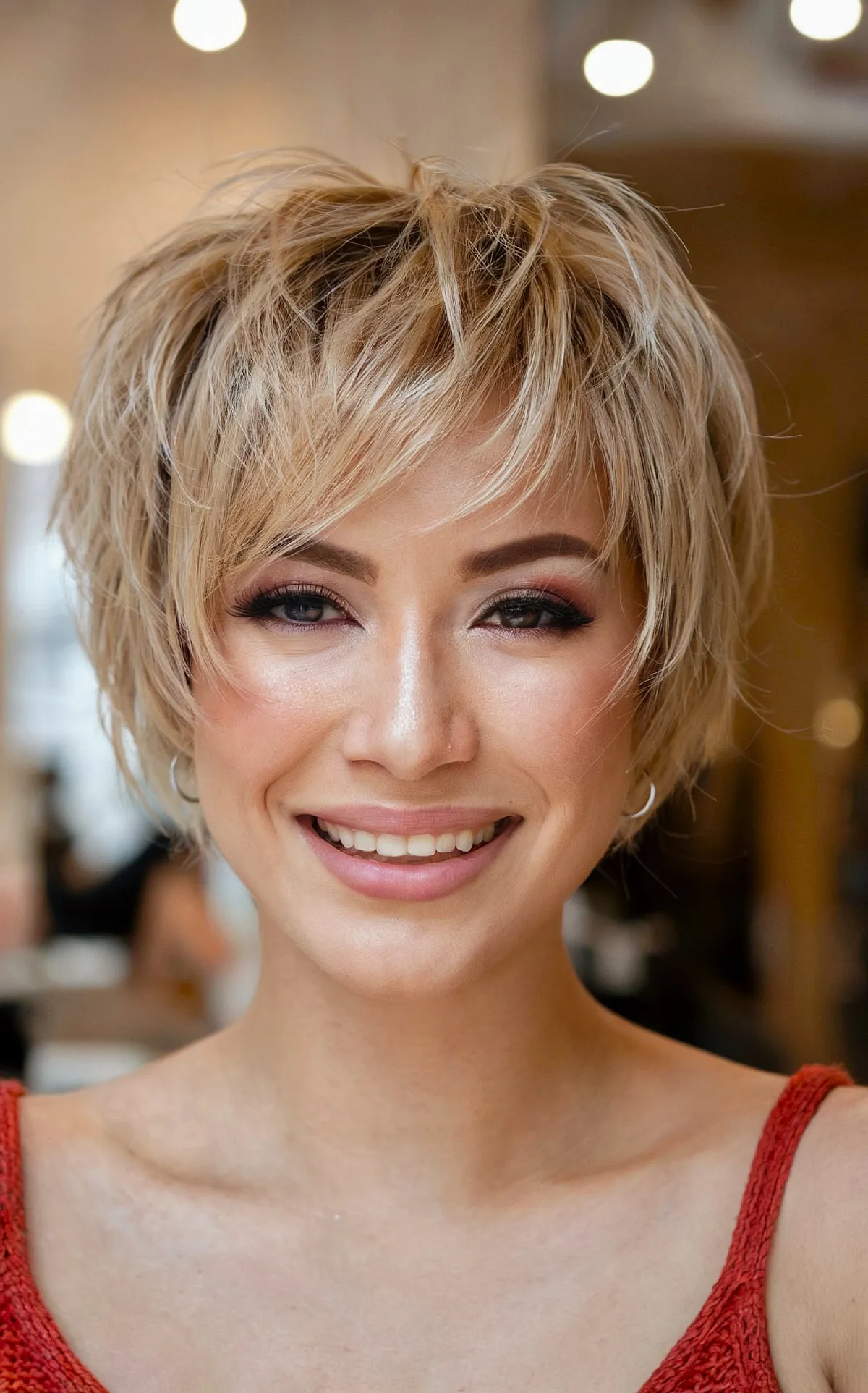 Ask for an effortless shaggy pixie cut. A trendy shag pixie can shape and contour your face and profile. Be aware of the length around the ears and back so it doesn’t look like dog ears hanging. You might love getting a razor cut to create a soft moveable texture to prevent that from happening.
