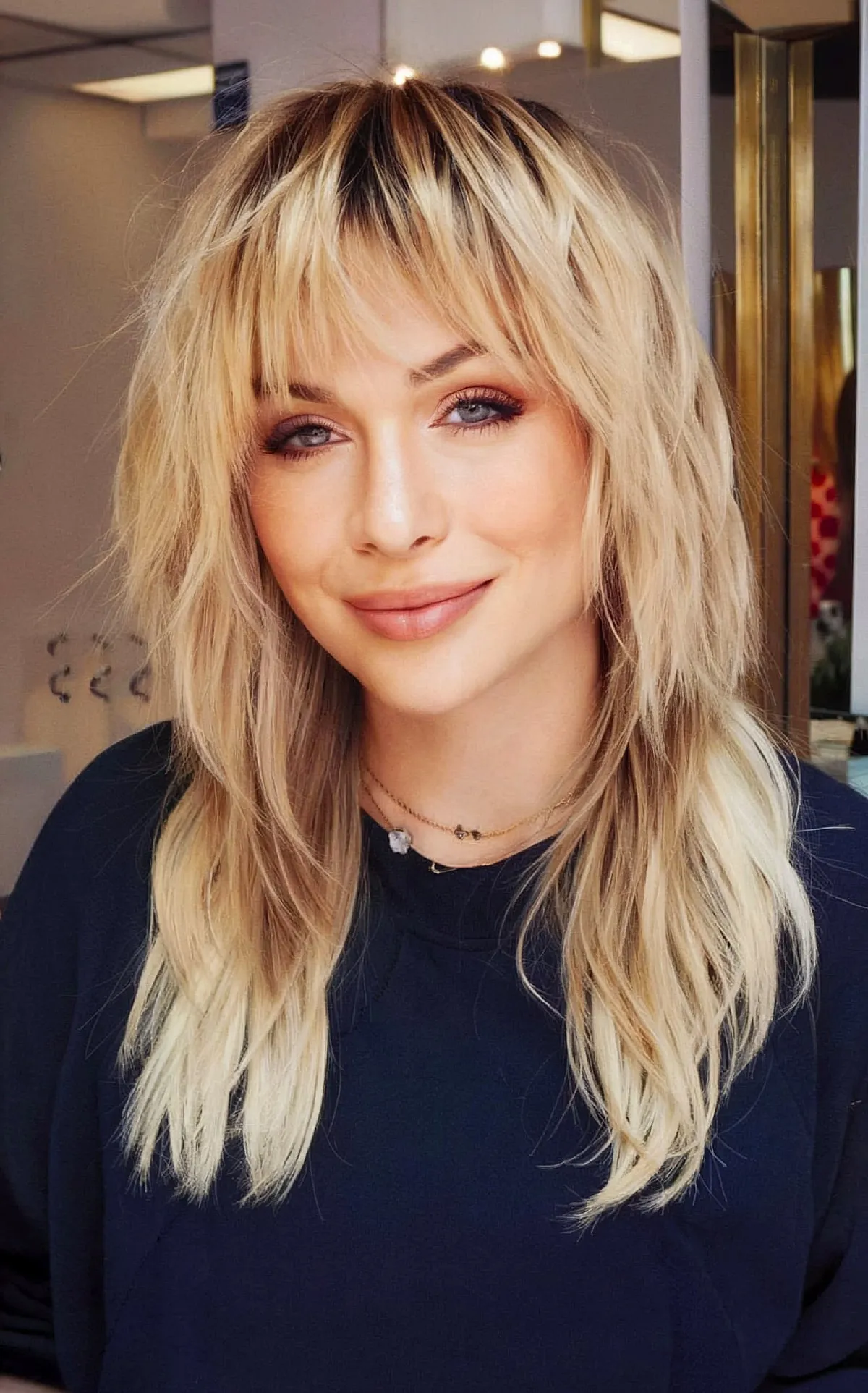 If you’re contemplating shaggy hairstyles with bangs, one thing to consider is your face shape. Where your bangs start in this look can enhance or downplay certain facial features. Your stylist can tailor the remainder of your cut based on your bang starting length.