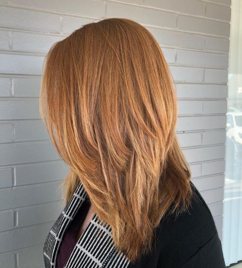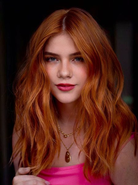 This stunning layered copper mid-length hair with choppy ends and a middle part is beautiful. Instead of opting for the same long layers, this haircut presents a fresh alternative. And all while still maintaining a soft and feminine touch. This style is suitable for various lifestyles. It can be dressed up or down based on your preference. It’s also flexible enough that you can alternate between side parts or even center parts. Change things up without sacrificing its chic vibe.