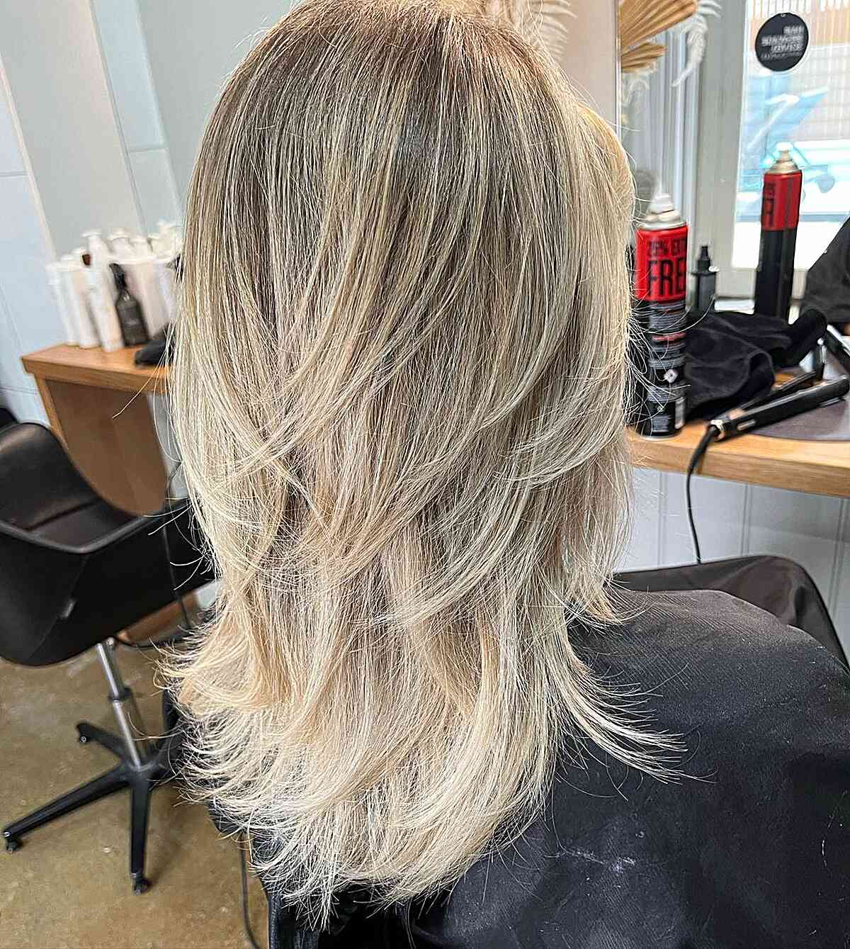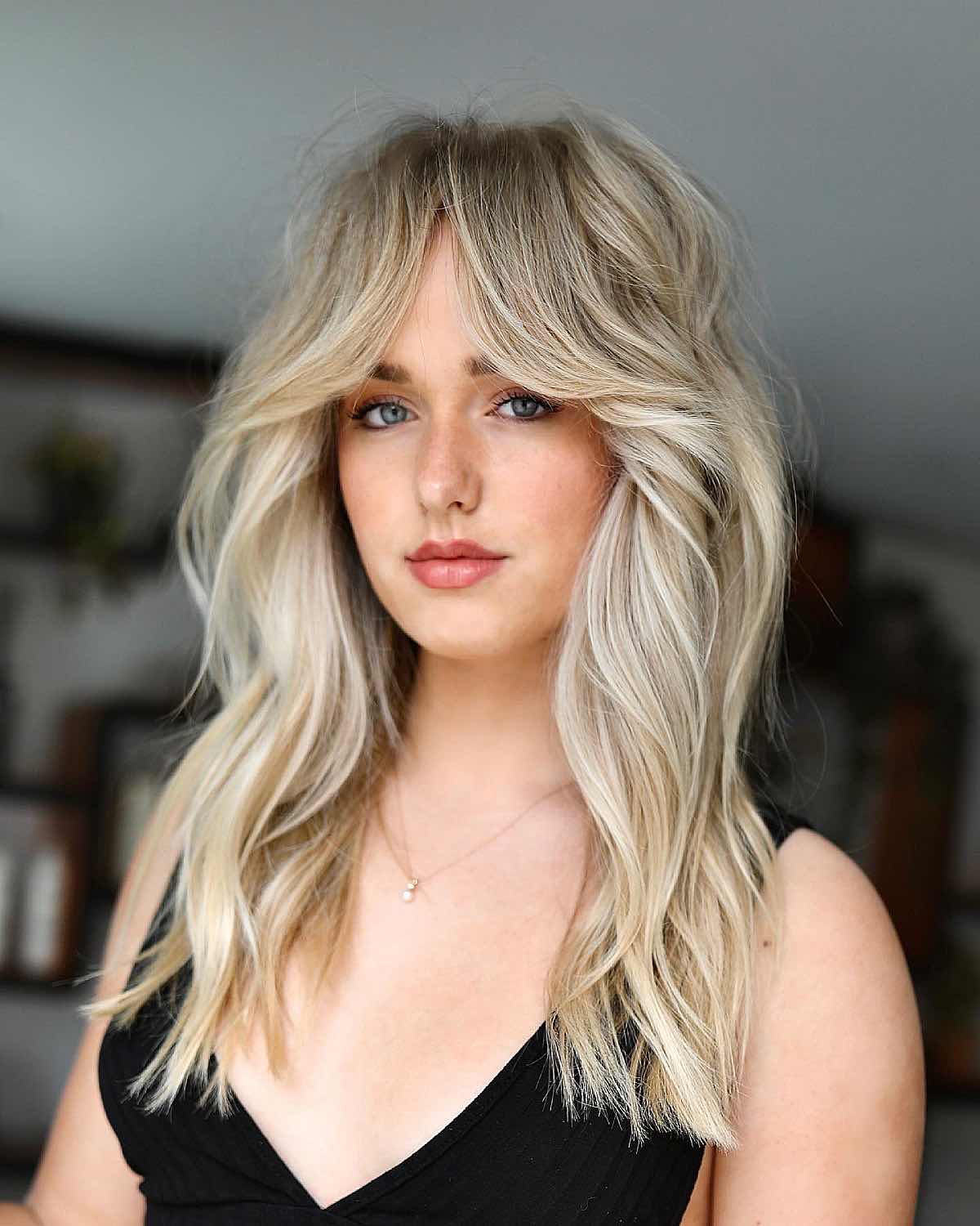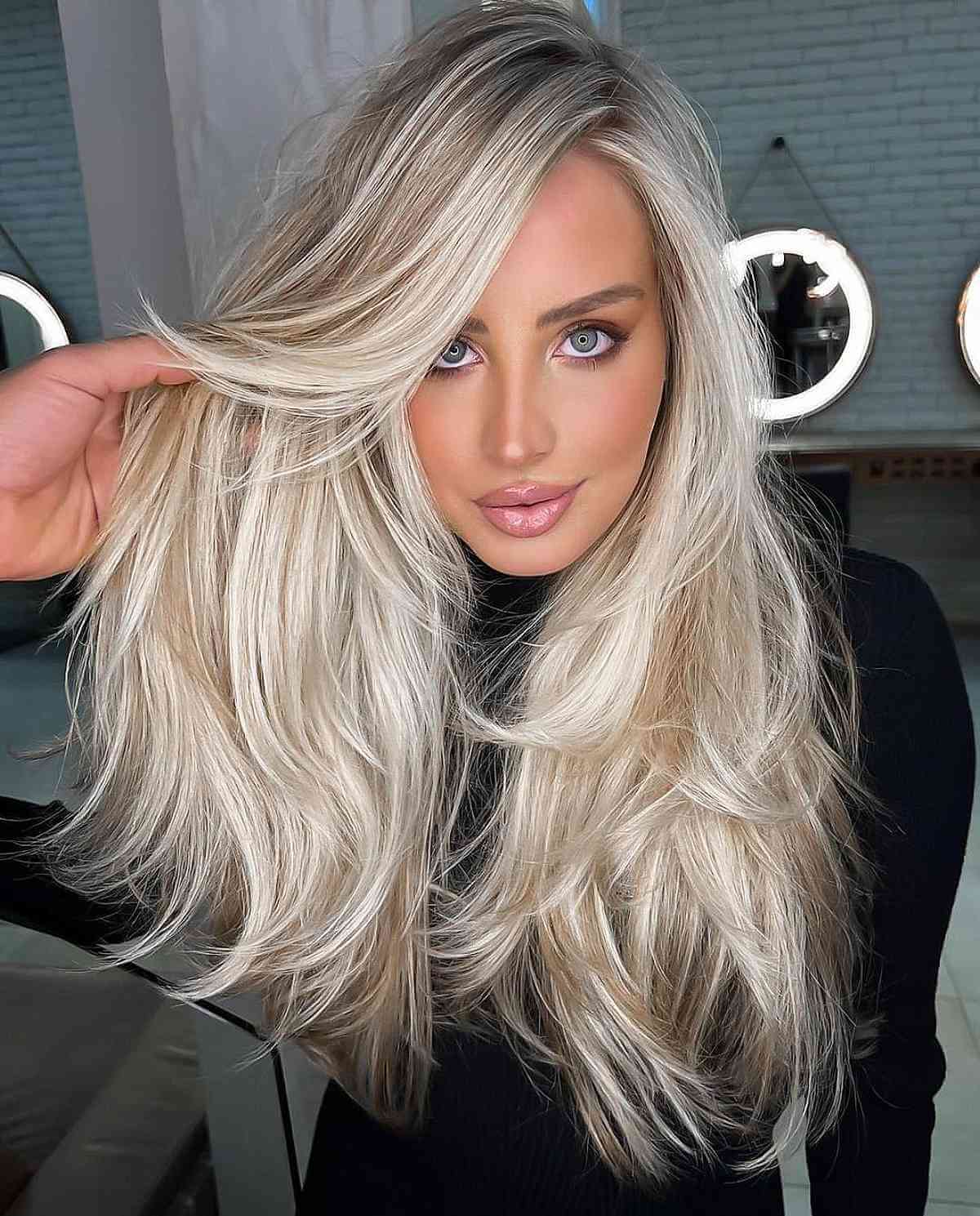 The platinum blonde long choppy layers, often referred to as a butterfly haircut, feature abundant layers at the crown and in face-framing sections to add soft volume. To achieve a soft, bouncy blowout, utilizing a large round brush along with setting clips is highly effective. If you have thicker hair, incorporating soft texturing is recommended to complete your haircut.