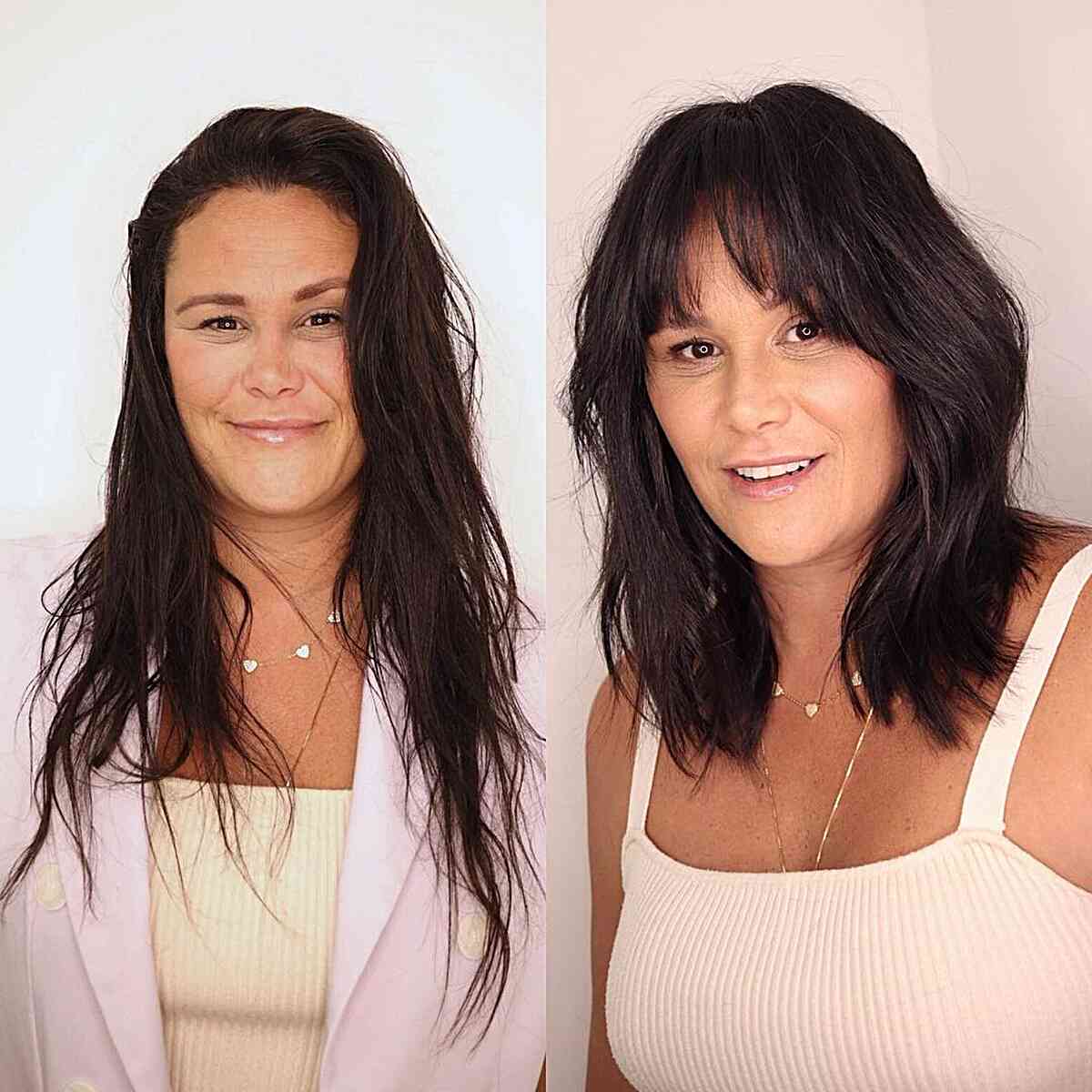 I would describe this look as a layered, piecey lob featuring soft face-framing bangs. I recommend this to someone with sufficient density for bangs and ready to dedicate time to style a fringe daily.