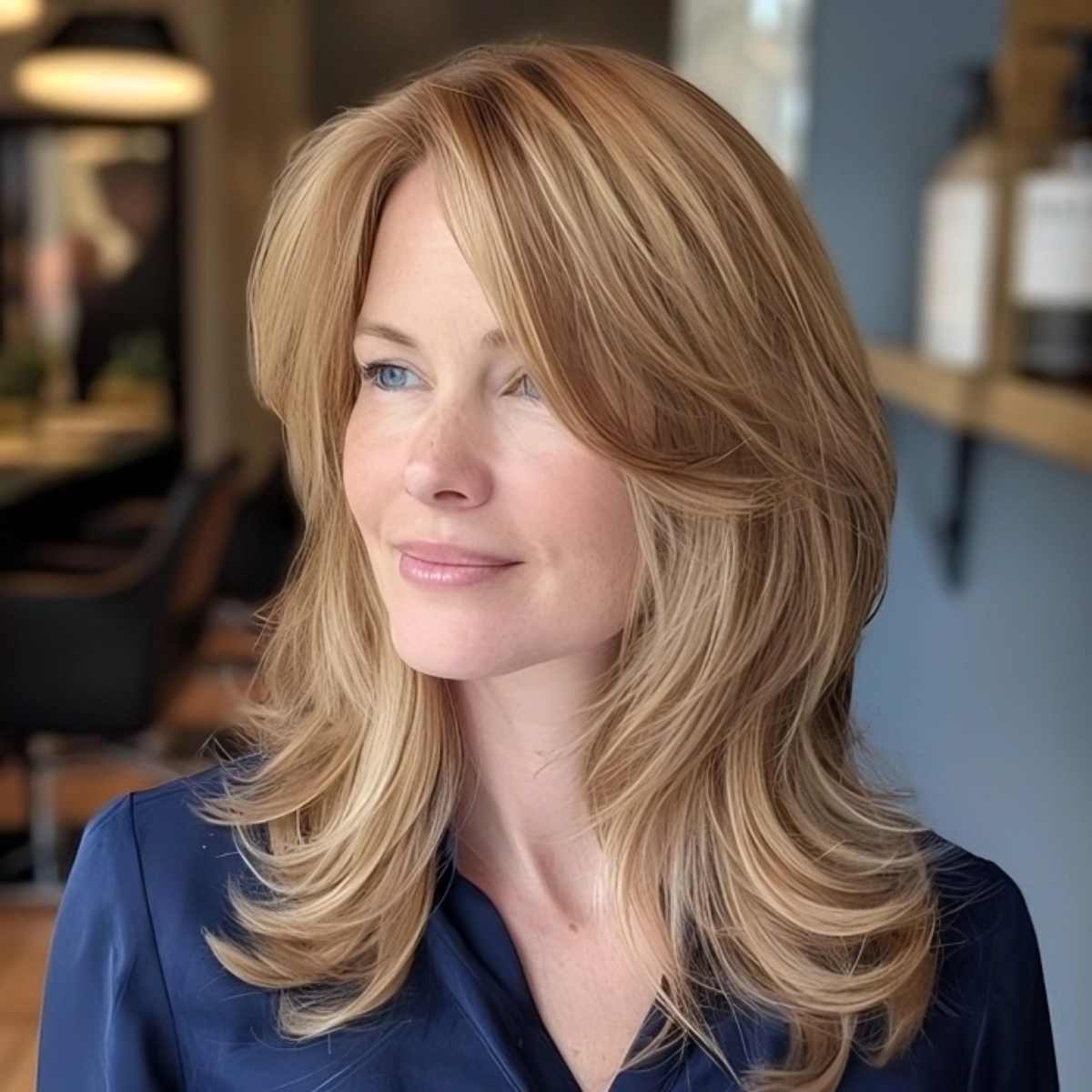Sleek seamless layers provide an excellent option to transition from a short bob or enhance a mid-length hairstyle with added movement. Choose a center part and curtain bangs to maintain a youthful and contemporary look. For styling, I recommend using a 1 1/4 curling iron to achieve effortless waves.