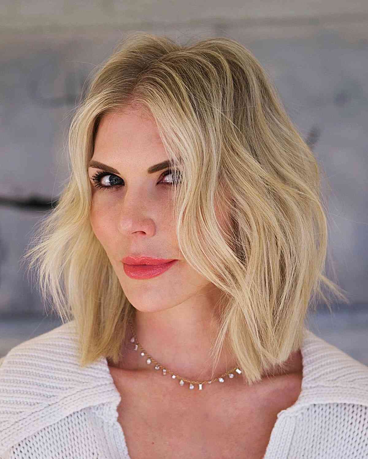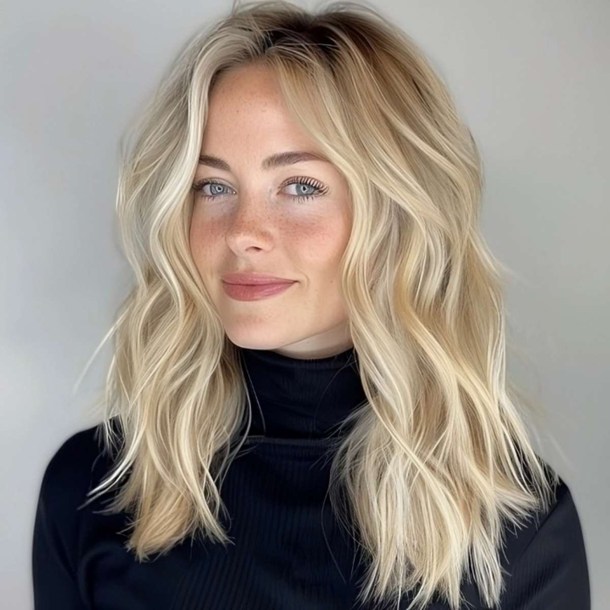 Gentle wavy layers on a platinum blonde shade have a stunning and feminine payoff. These choppy layers appear even better with a touch of texture for added dimension. A combination of sea salt spray and sugar spray enhances the movement without weighing down the hair. Though the style is most flattering on thick tresses, it can still bring some charm to thin locks. Finer hair types may want to try rollers to maintain the style for an extended period.