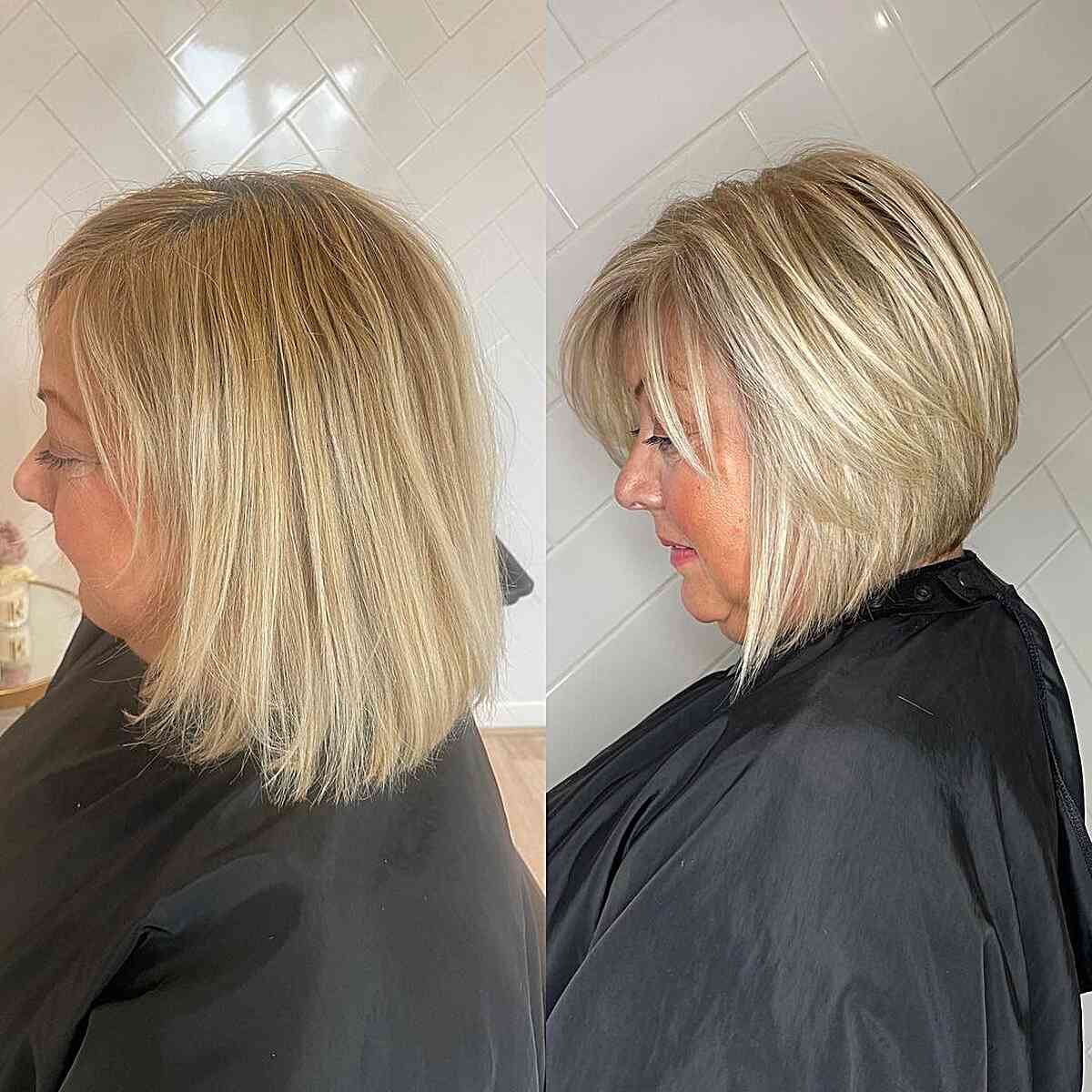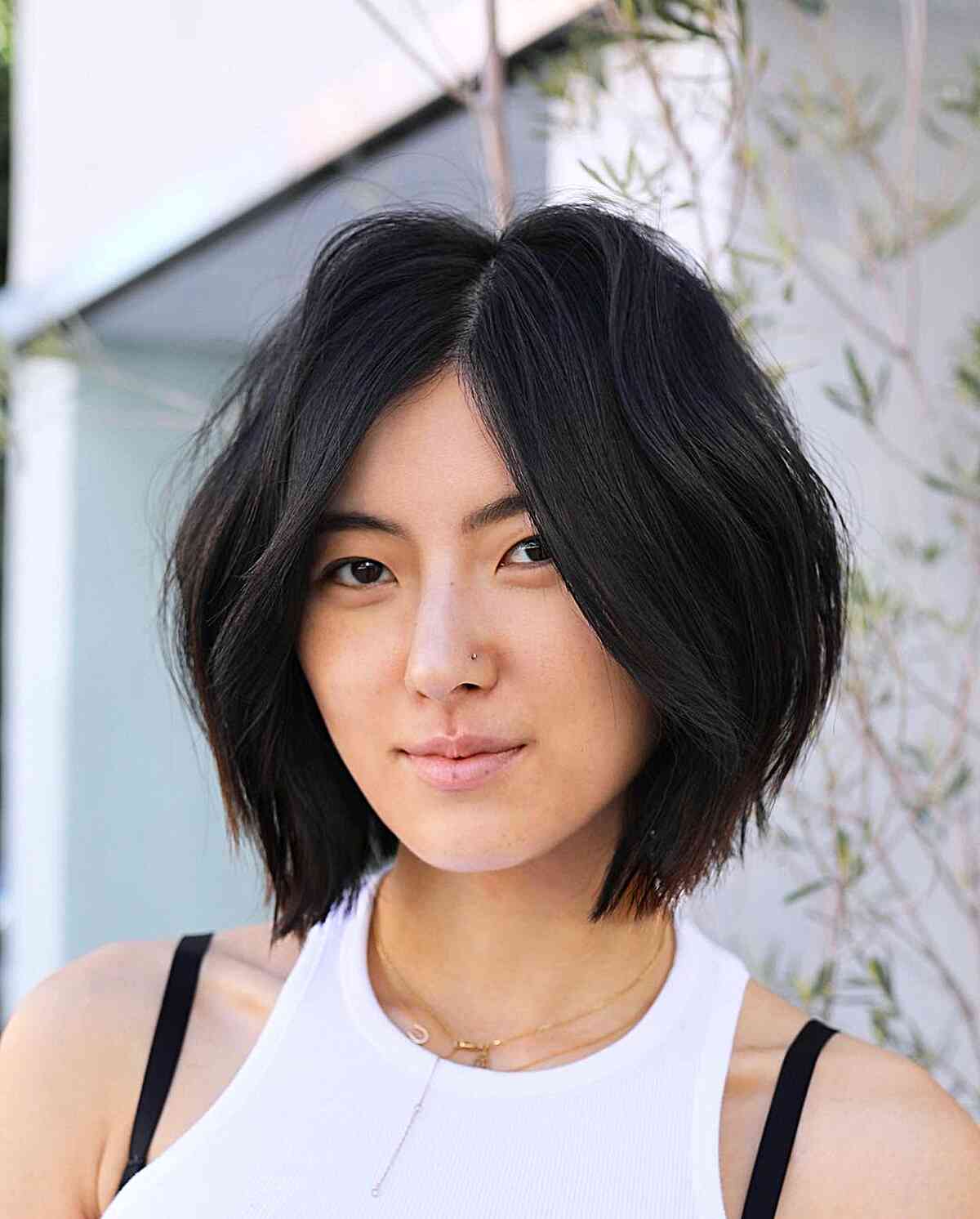 A graduated bob with layers creates a lovely rounded shape with added volume at the crown. You might be curious whether textured layers suit fine hair, and the answer is yes. However, be cautious of excessive layering, which can make finer hair appear too thin around the edges. A disconnected layer can effectively maintain perimeter weight.