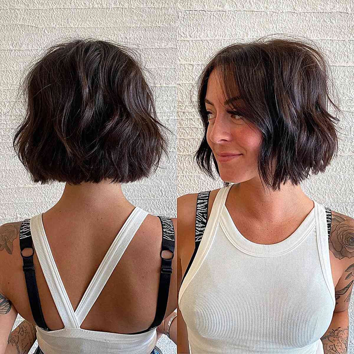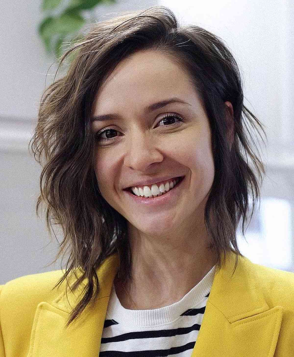 Textured short waves that are slightly tousled appear incredibly stylish and adorable. The dynamic look accentuates the short layers beautifully. This is a fantastic option as a transitional style when looking to grow out a shorter haircut. These textured short waves are styled in a subtle angled bob that rests just above the shoulders. To enhance volume and movement, shorter layers in the back and longer layers framing the face were incorporated.
