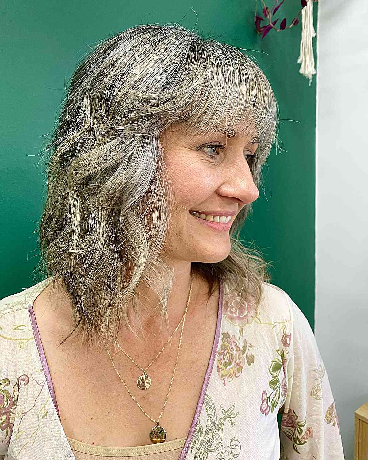 Layered choppy face-framing styles bring a subtle ’90s flair. They feature a contemporary layering technique that complements a mid-length haircut. Women everywhere can embrace the versatility and chicness of this trending look.