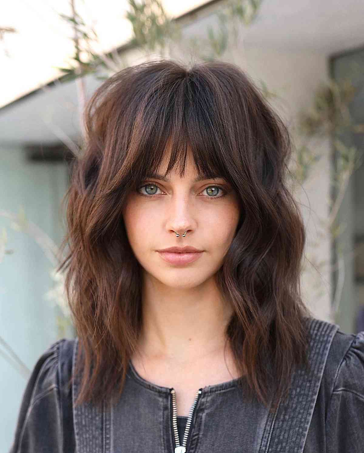 Explore a stylish layered and choppy cut featuring bangs. To enhance movement and texture in thick hair, incorporating layers is a fantastic approach. A razor cut effectively emphasizes texture and encourages natural waves if that’s your goal. French bangs, when integrated with the already mentioned layered style, offer a gentle feminine flair and can be tailored to complement your face shape.