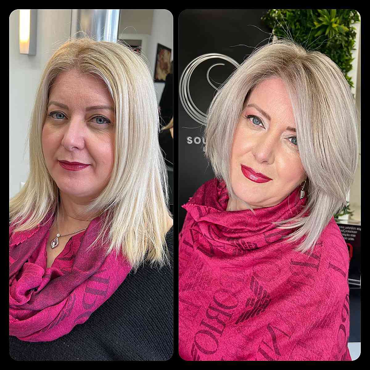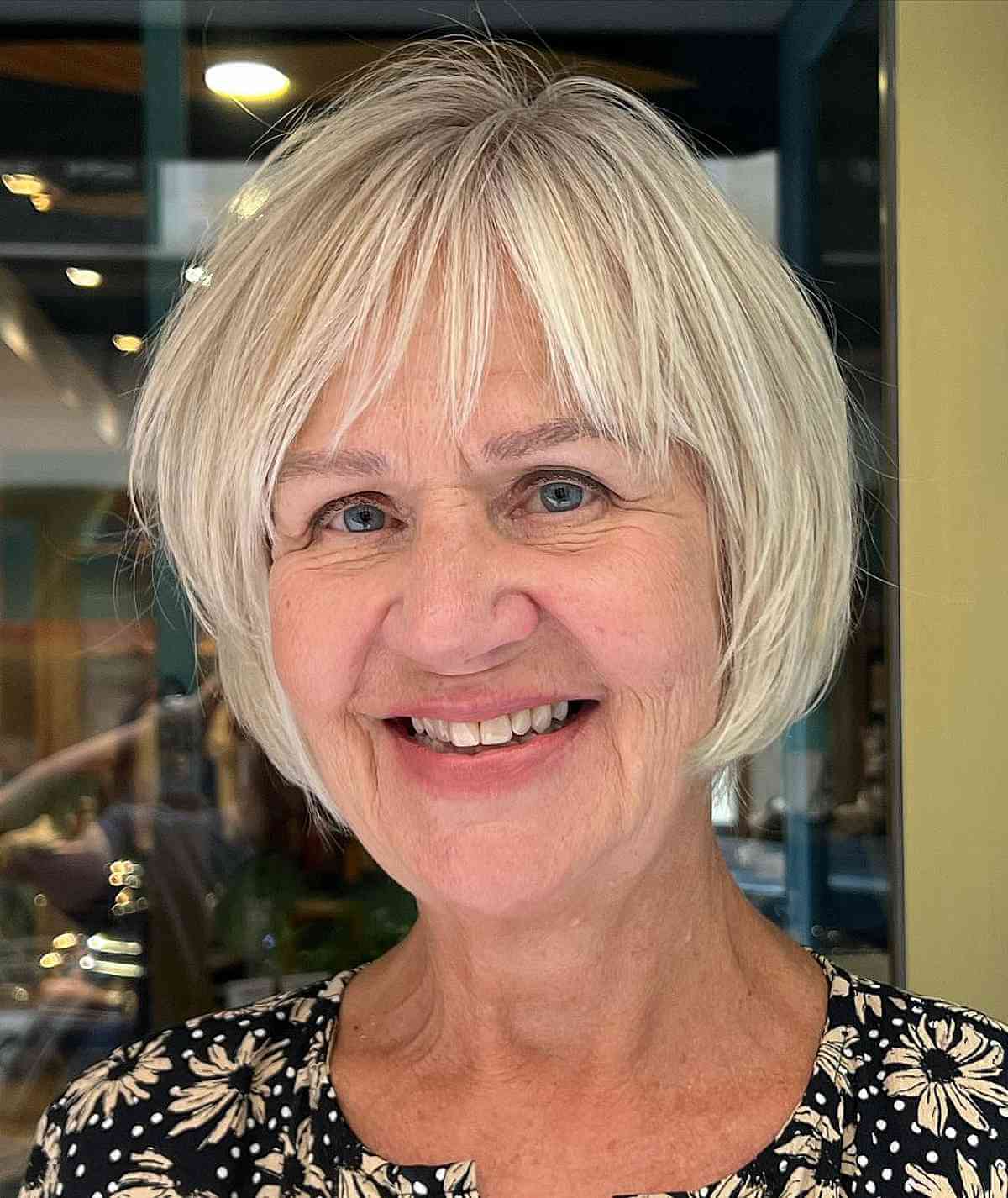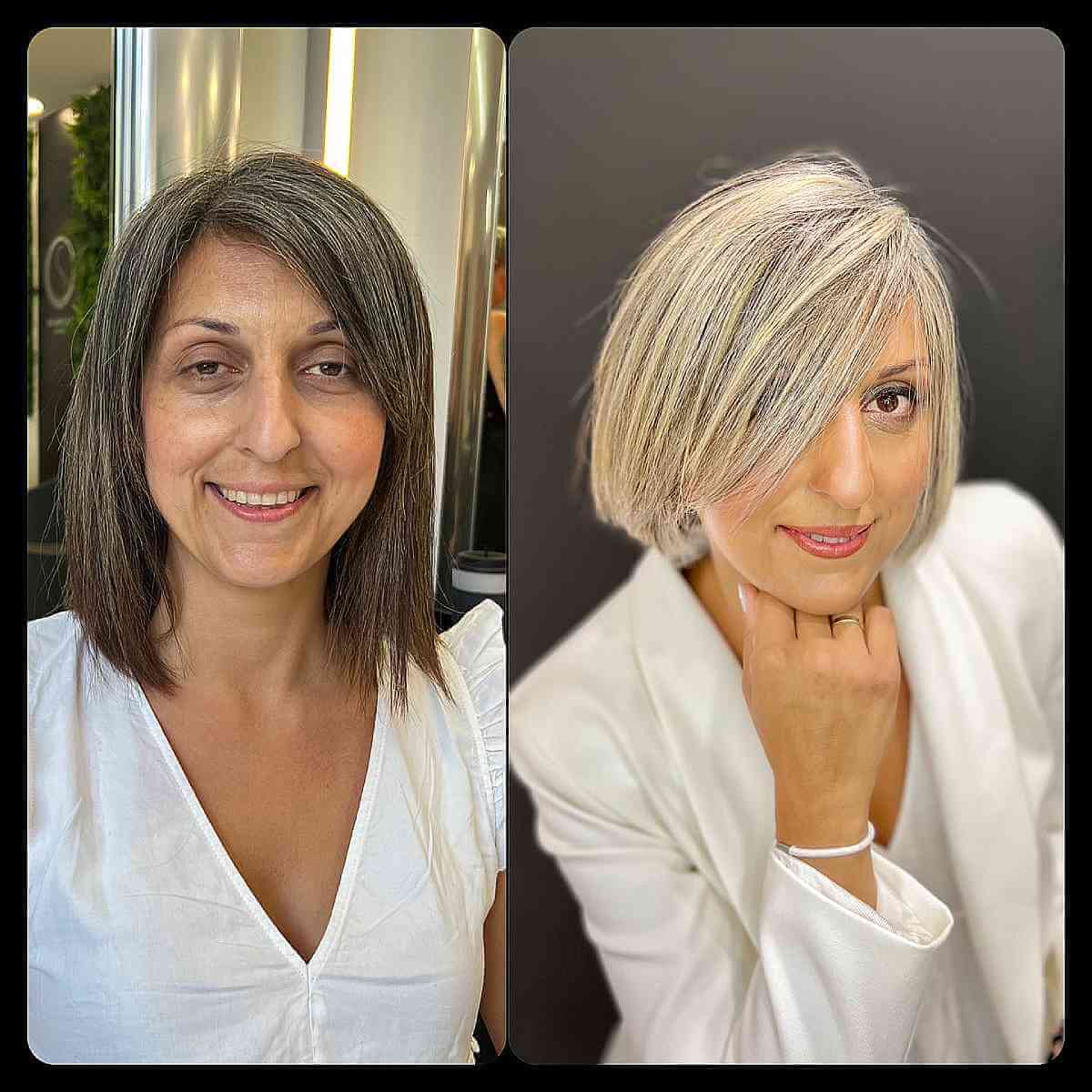 A chic side-parted blonde bob is a lovely choice for older women aiming to incorporate their grey hair. If you’re considering a new hairstyle, keep in mind that a bob should reach at least chin-length for the most flattering effect. Combine this bob with blonde highlights to seamlessly blend your natural grey, and you’ll achieve an elegant, refreshed look.