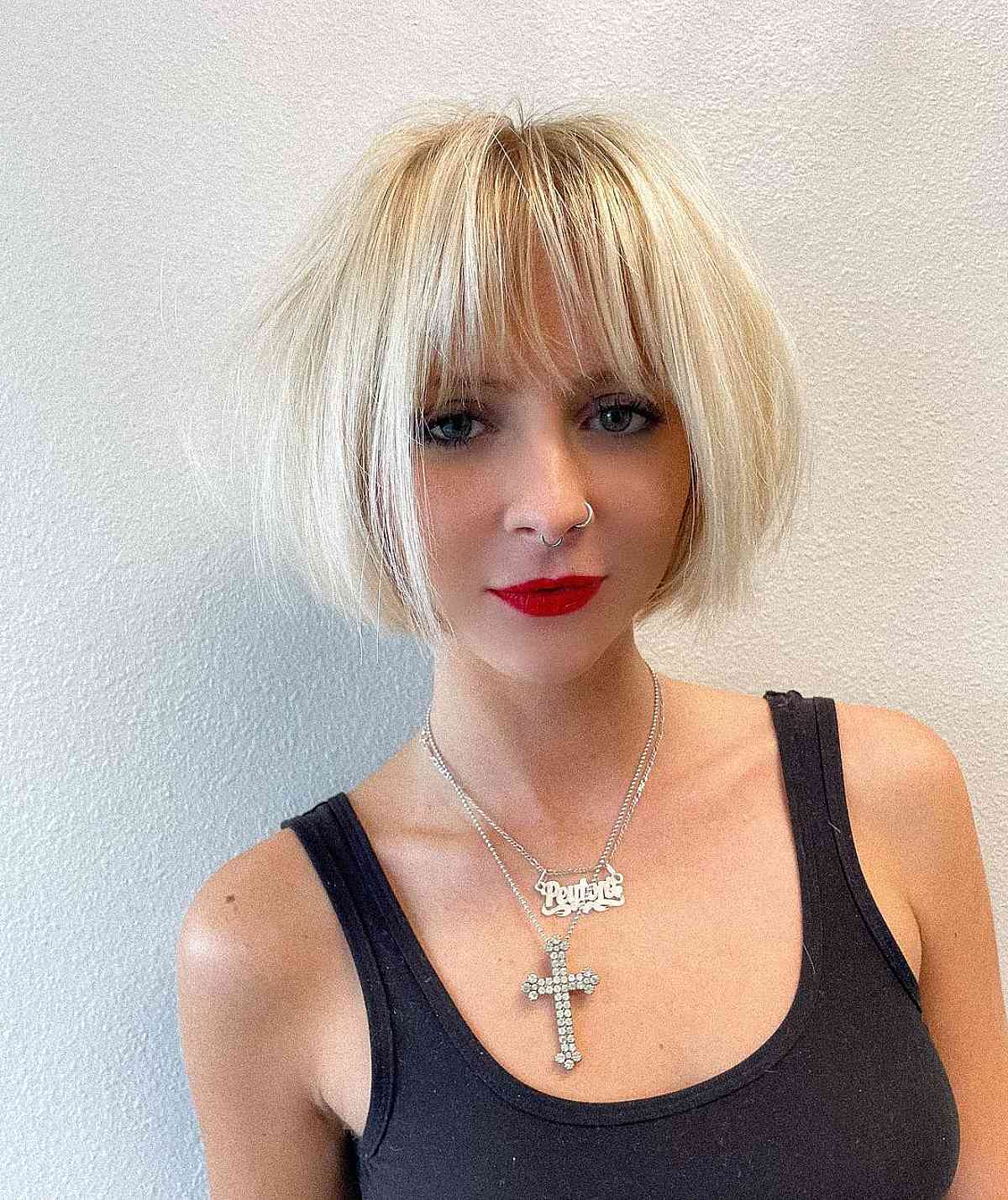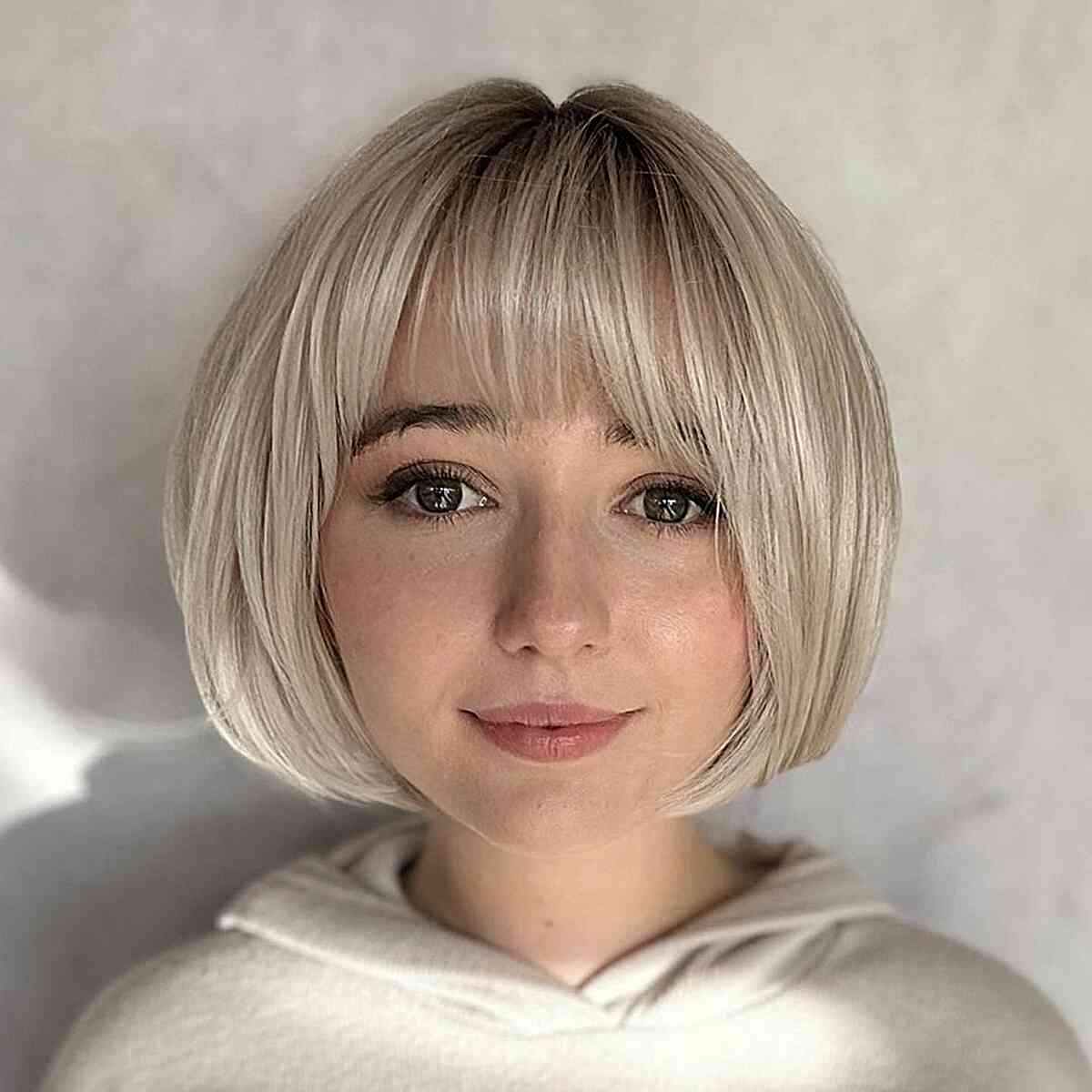 Embrace this chic blonde bob with bangs and achieve that effortless allure! This chin-length style is best suited for those with naturally straight hair. To maintain this hue, be sure to use purple shampoo to combat and minimize unwanted brassiness.