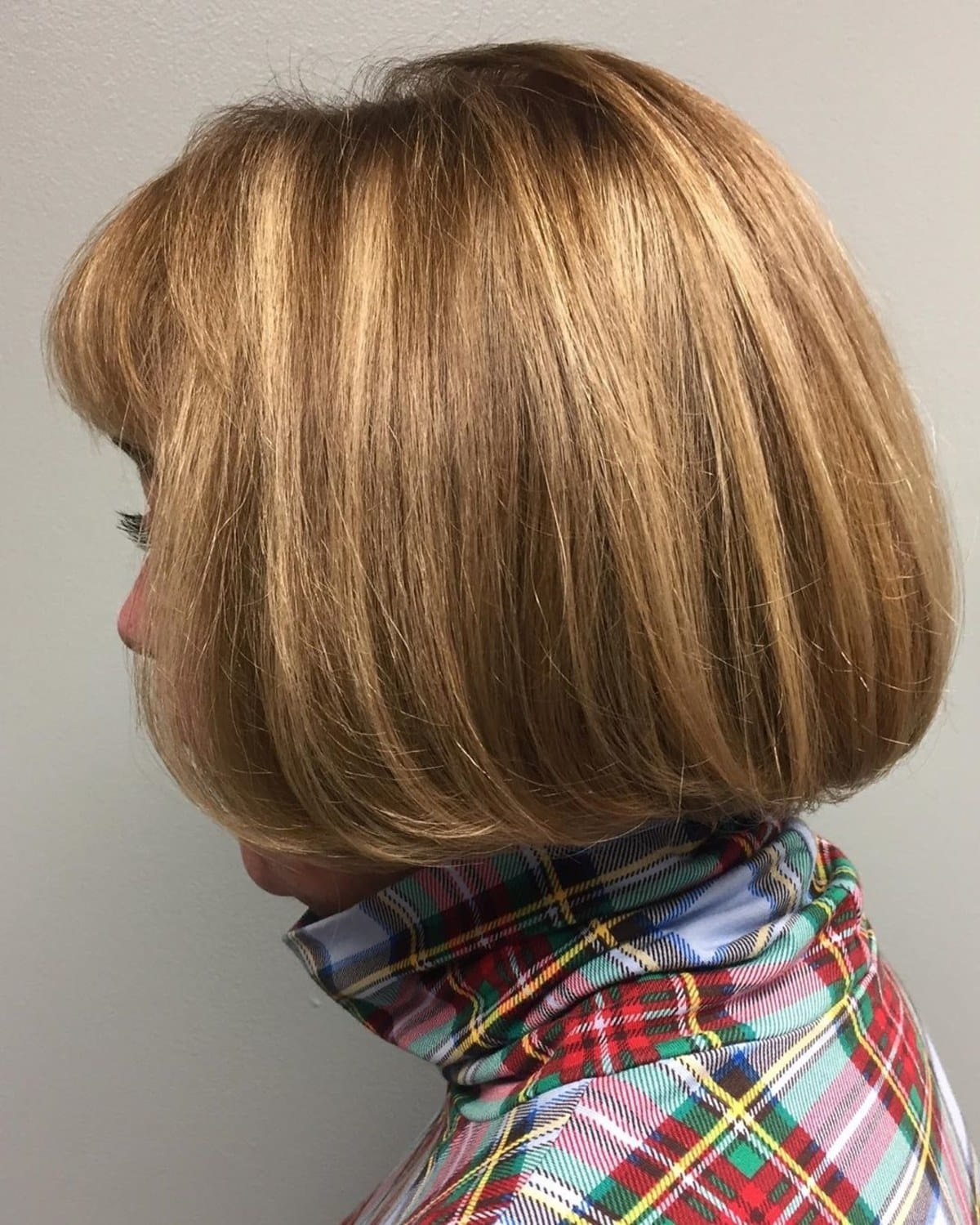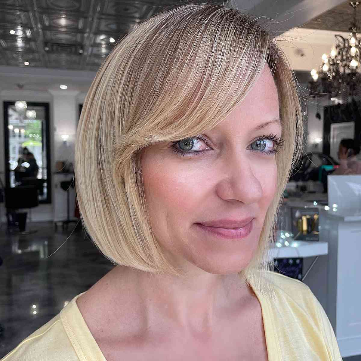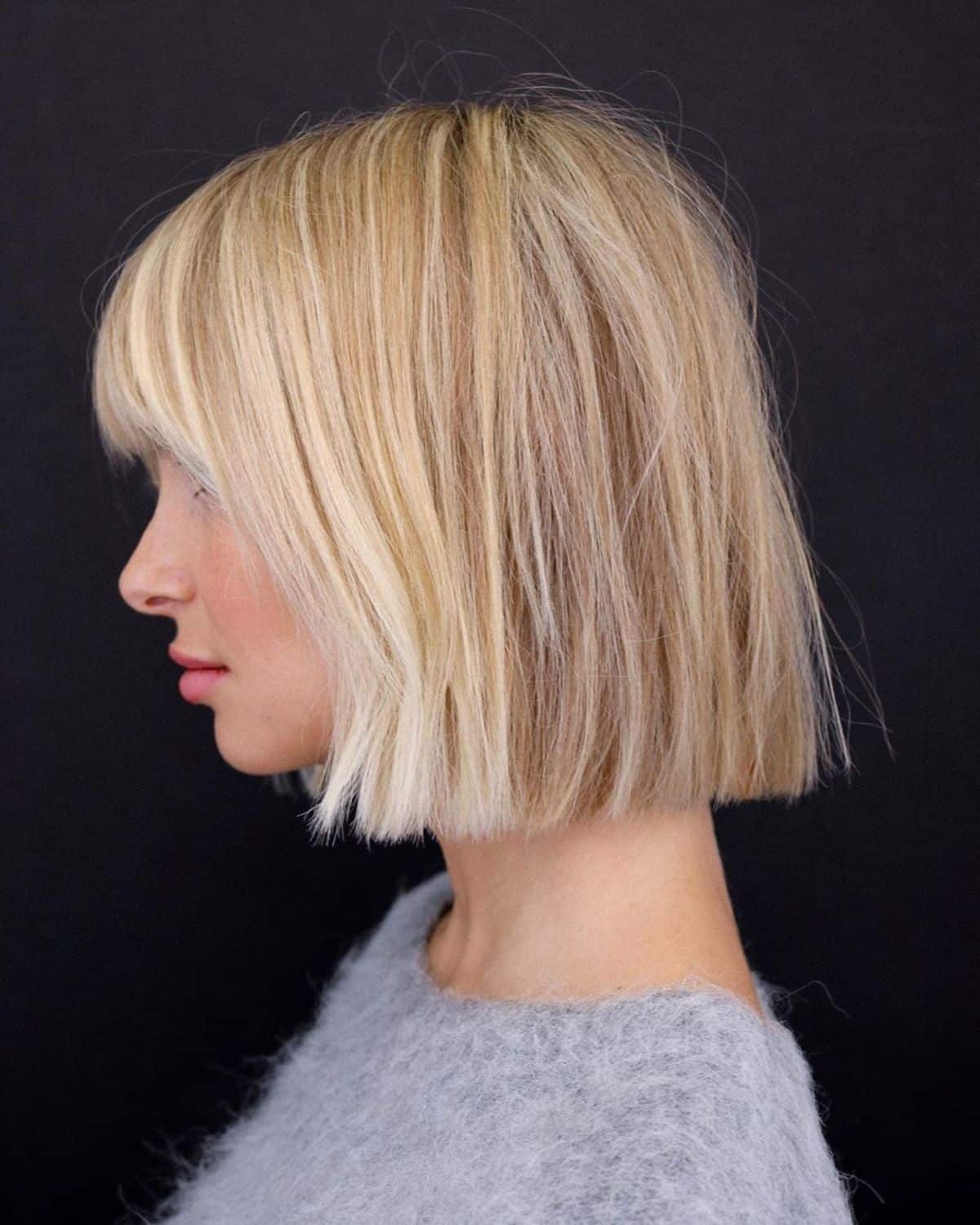 If your hair is on the finer side, consider a stylish blonde bob with side-swept bangs. Keeping your crop short helps with making fine hair look thicker and fuller.