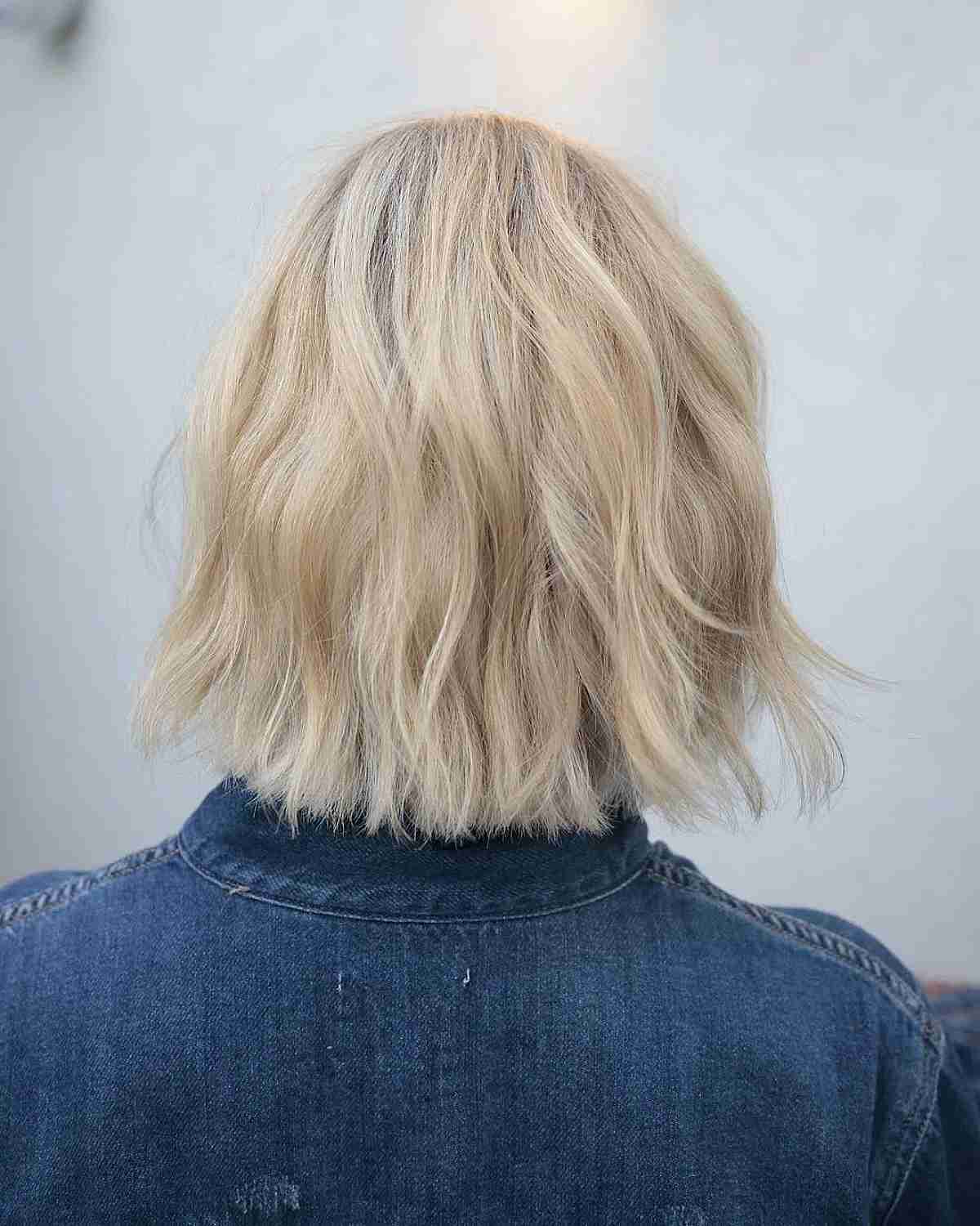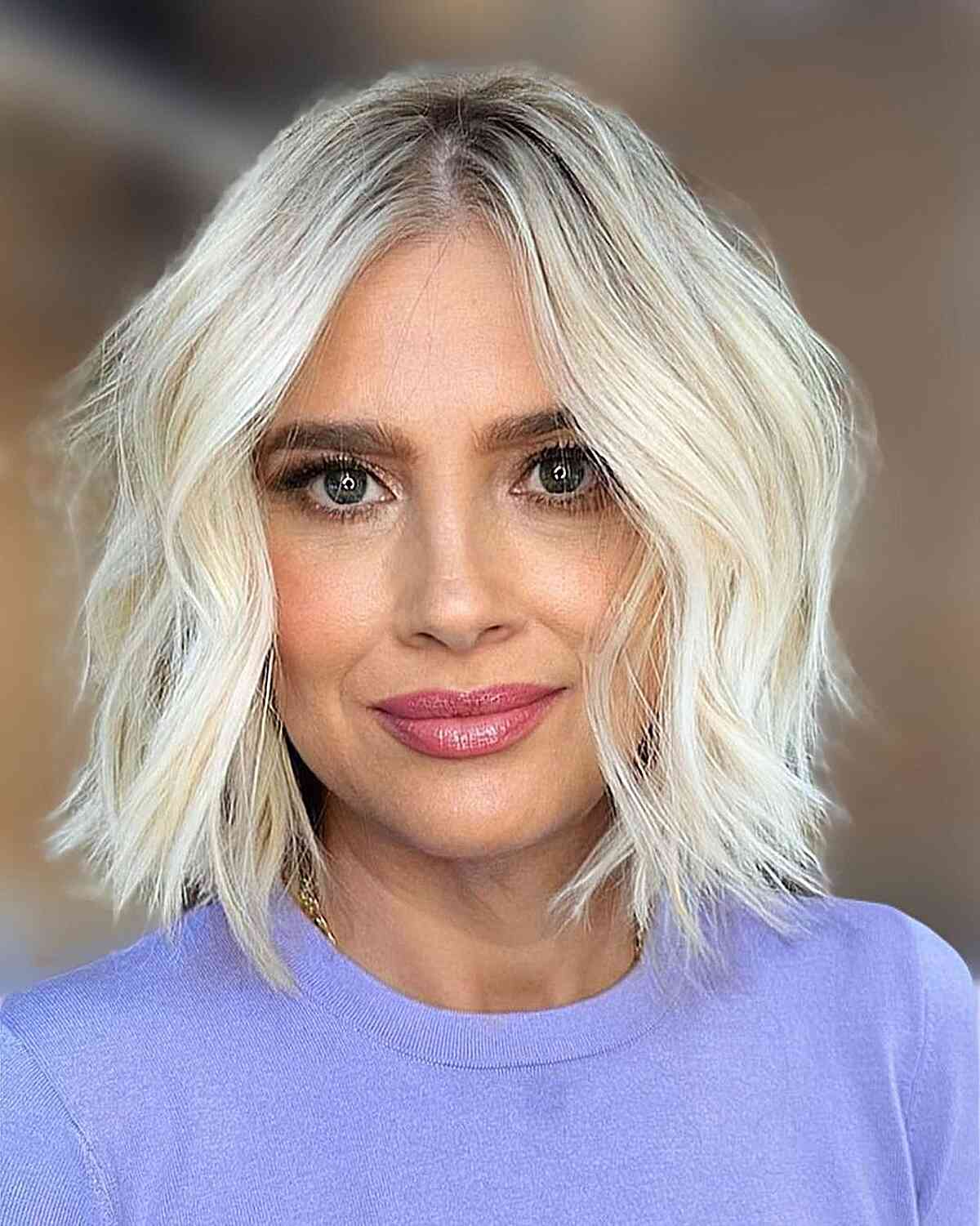 This textured bob appears incredibly striking with waves that emphasize the mid-lengths. The flow enhances the ash-blonde shades beautifully, creating a captivating look. For a fabulous style that endures throughout the day, apply a dry texture spray to this neck-length haircut.