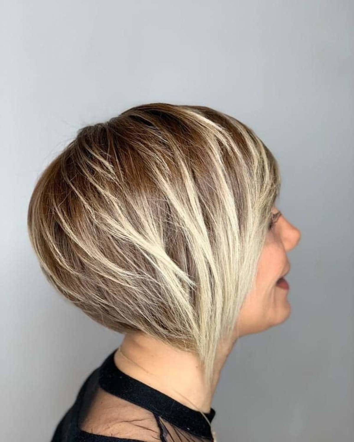 The textured chocolate and blonde bob is rich with dimension and style. Short hair is captivating and adorned with soft, warm-toned highlights. Talk to your stylist about leaving depth and darkness underneath your hair while adding caramel blonde highlights to the top of your hair and around the face. It makes the stunning blonde streaks stand out even more.