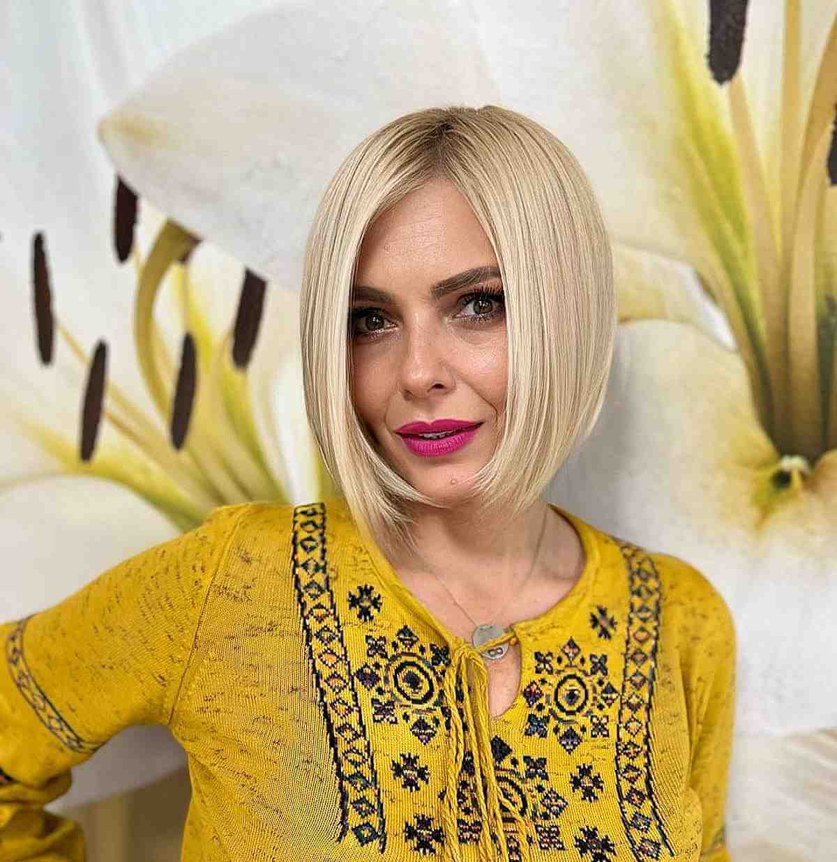 A short blonde bob haircut is a fresh, lovely style featuring bright, yellowish hues. The best aspect of this hair trend is that it’s customizable. Feel free to adjust the cut to complement any face shape or modify the shade to enhance your skin tone.