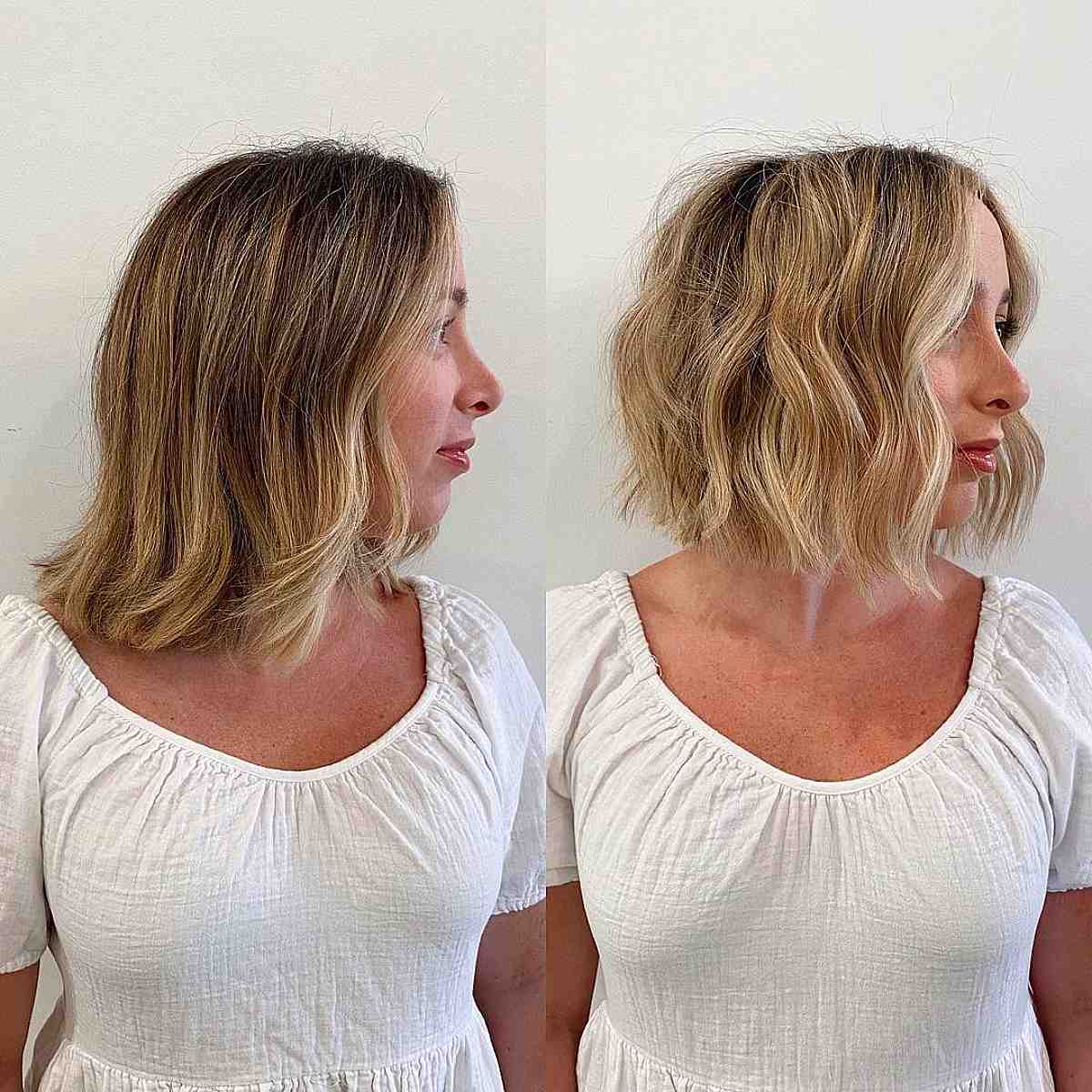 Searching for a trim to enhance your multi-dimensional diamond blonde and naturally wavy locks? Check out this medium wavy bob featuring blonde highlights and babylights, which embodies contemporary elegance. Maintaining shoulder-length will give your fine hair a fuller appearance. Jagged ends will stand out even more if styled with beach waves.