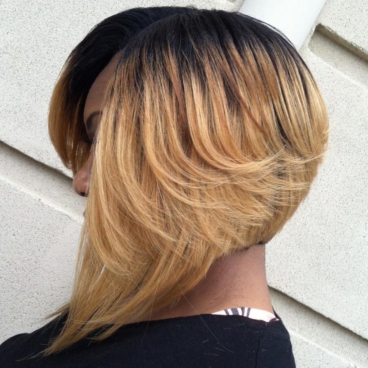 This stylish rounded blonde bob weave with longer strands around the face is a fantastic choice for your next hair transformation. And yes, you can explore a new hue without damaging your natural locks with chemicals! Part of the mane near the root is black to create a gradient effect. Achieve such a sharp and distinctive look by maintaining the shape at the back rounded with longer layers at the front.