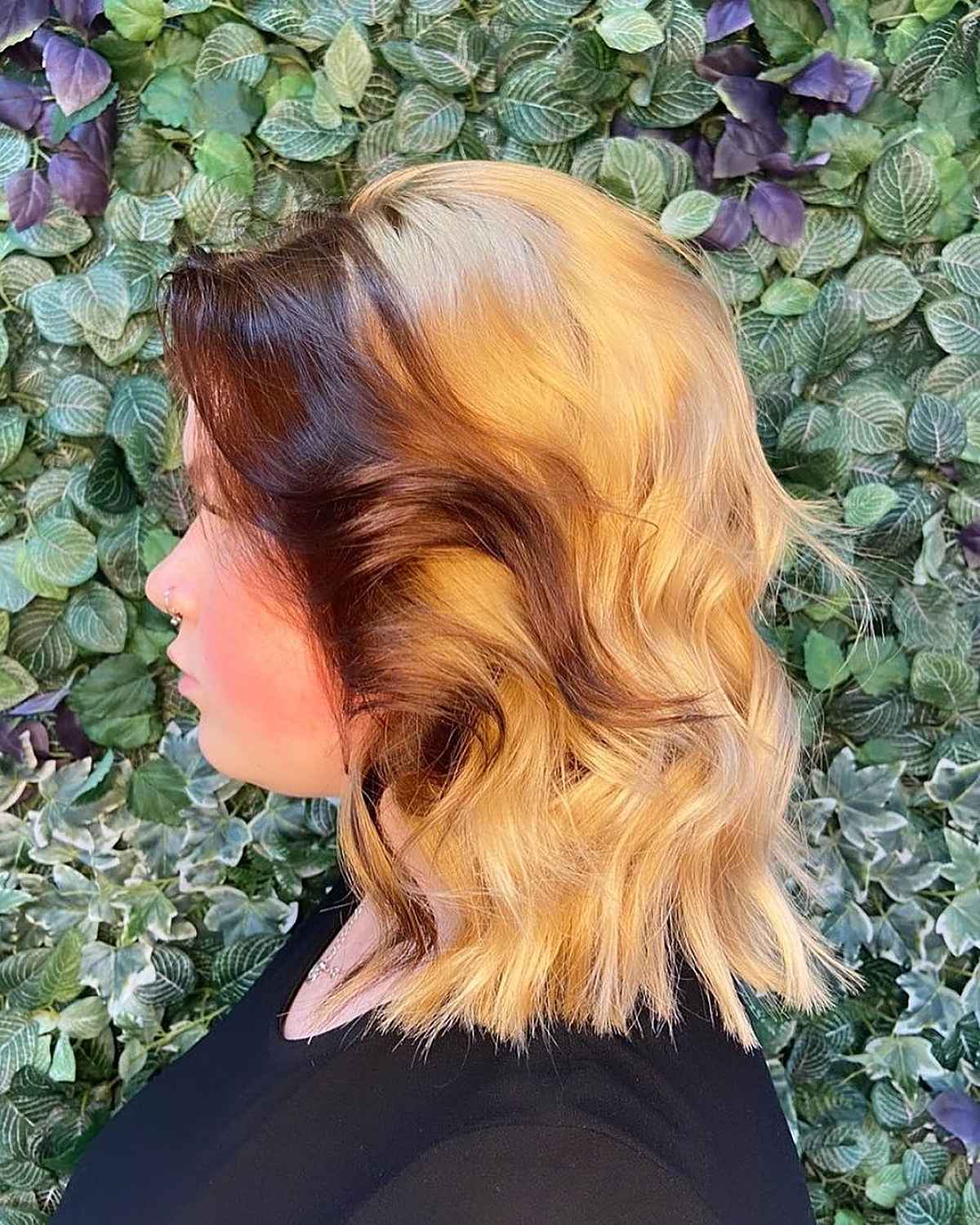 A brown money piece for blonde hair is an innovative and fashionable technique. Achieve this color by asking your hairstylist for some chunky brown-toned front with a honey blonde hue in the back.