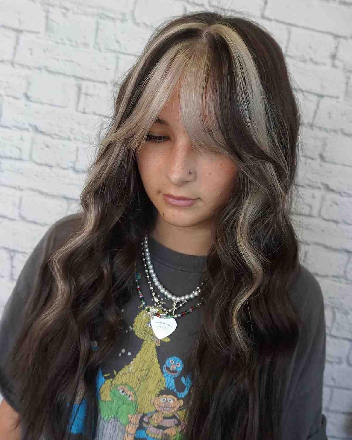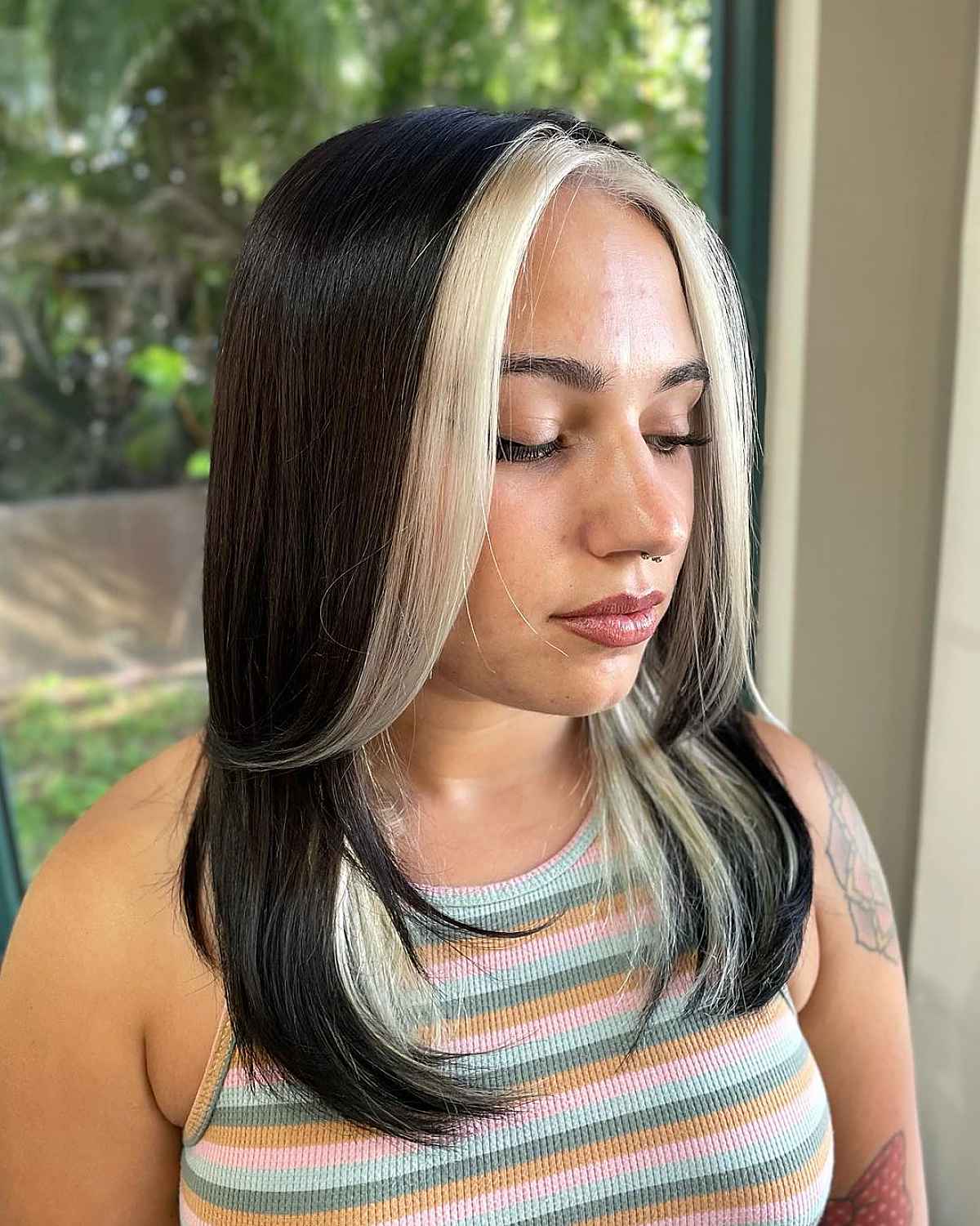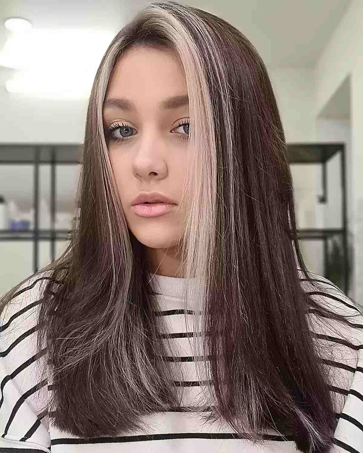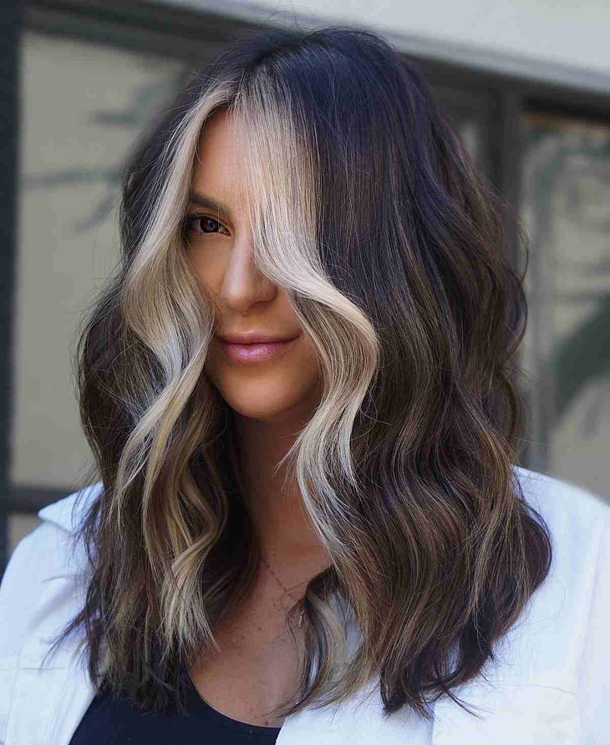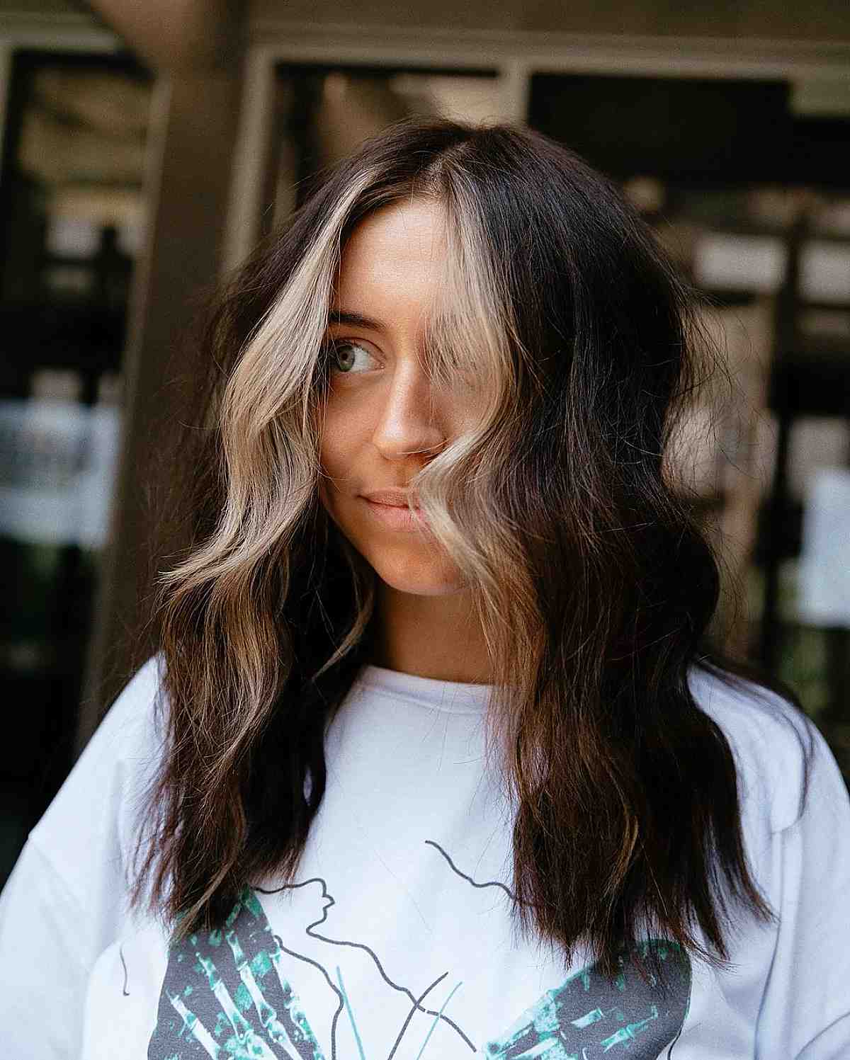 Achieve a daring appearance with deep brown locks featuring a striking blonde money piece. A bold and chunky highlight offers a lighter touch without the long-term commitment of full blonde hair. Enjoy a vibrant burst of color while minimizing the maintenance of an entirely highlighted style. It’s advisable to refresh the cut and toner every few months to keep your hair looking vibrant and in great condition.
