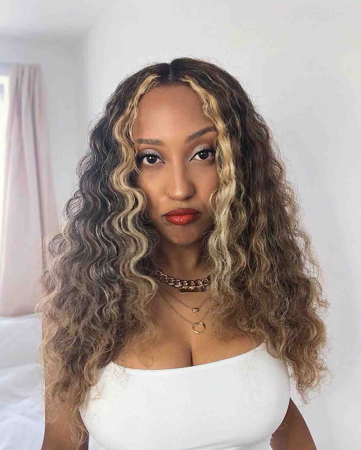 A striking streak of blonde around the faces of women with curly hair looks fantastic. If you have darker, textured hair, consider a warm caramel blonde money piece hair coloring technique to highlight your curls. It will keep your hair feeling vibrant and healthy.