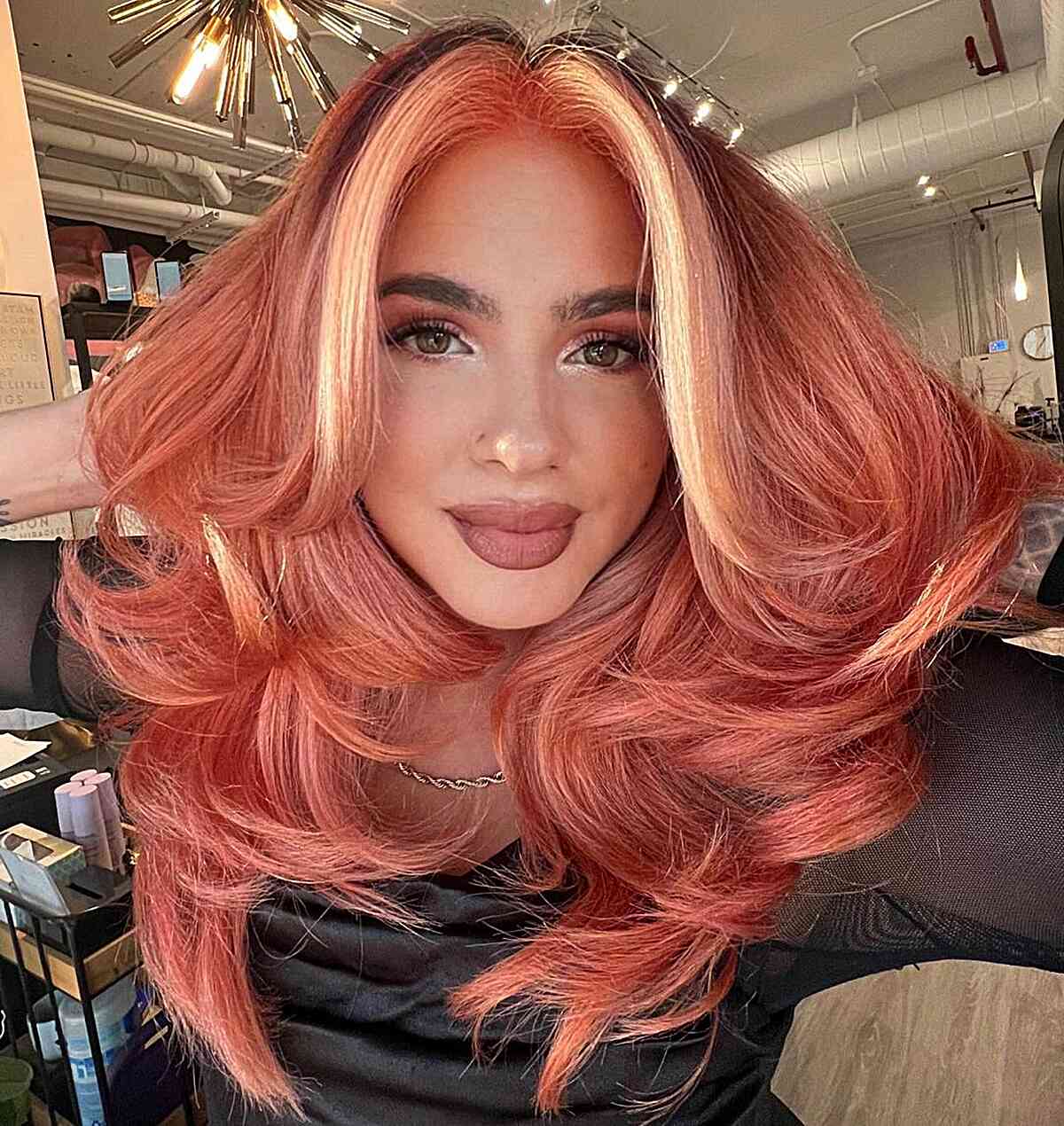 If you wish to make a statement, a charming rosy peach shade paired with a striking blonde piece would be ideal. To elevate this style and inject instant glamour, a full, voluminous blowout is essential. While your stylist may employ a round brush technique, using large heated rollers at home can yield a comparable effect. Let the rollers cool down before gently brushing them out.