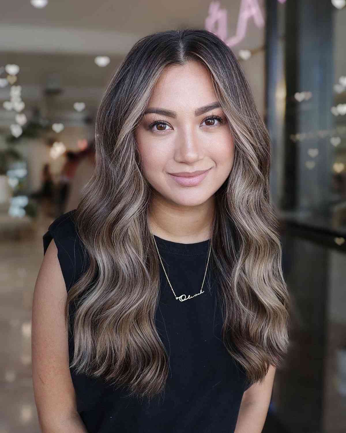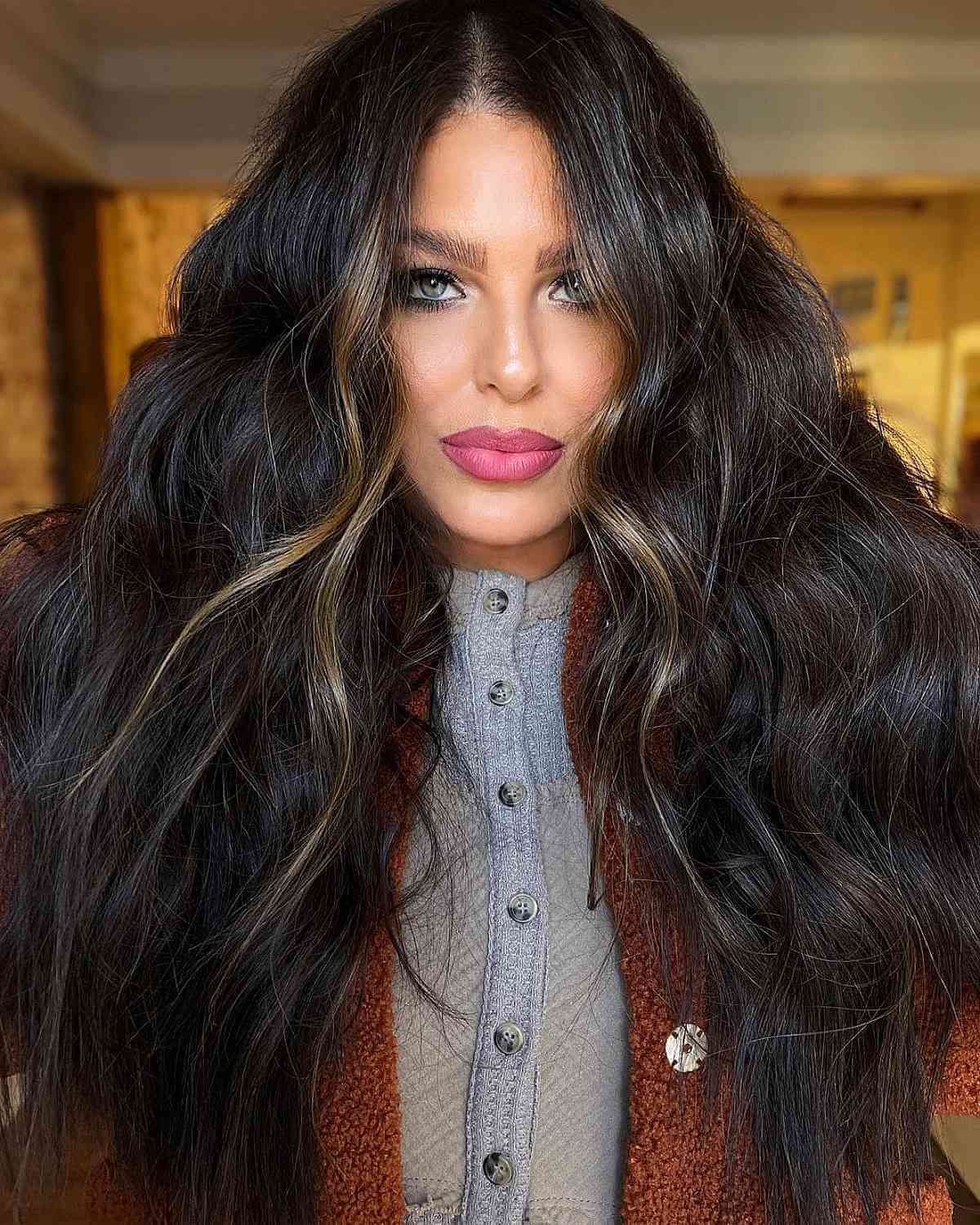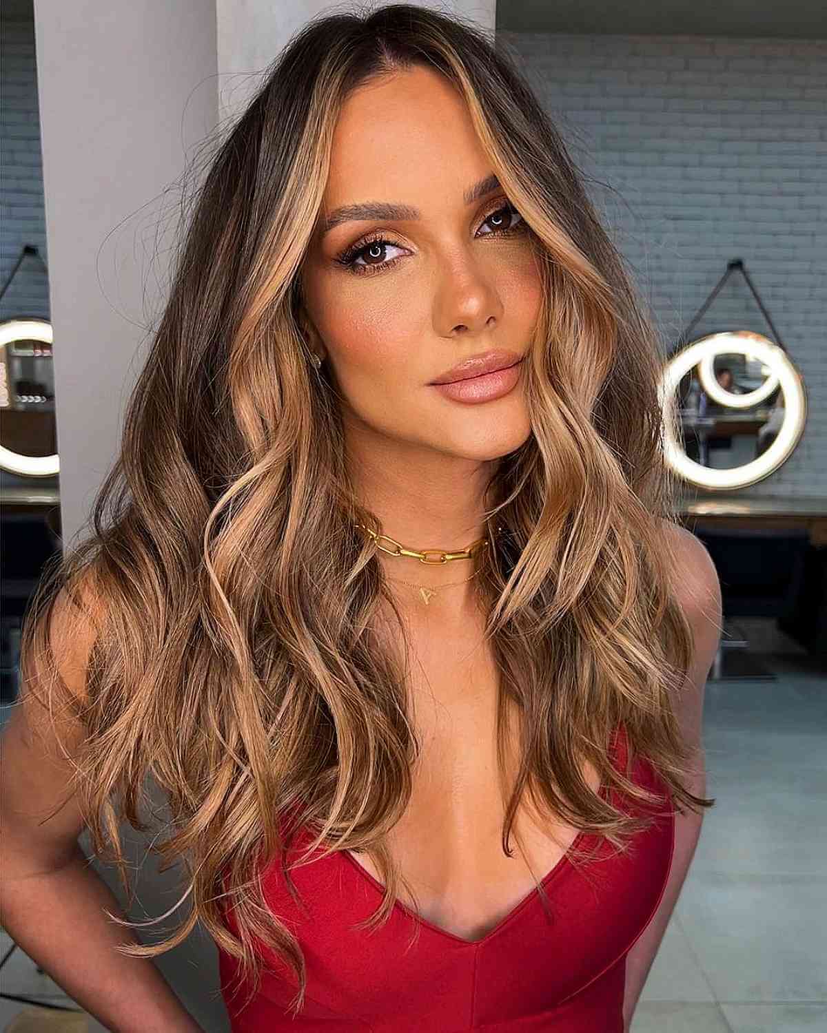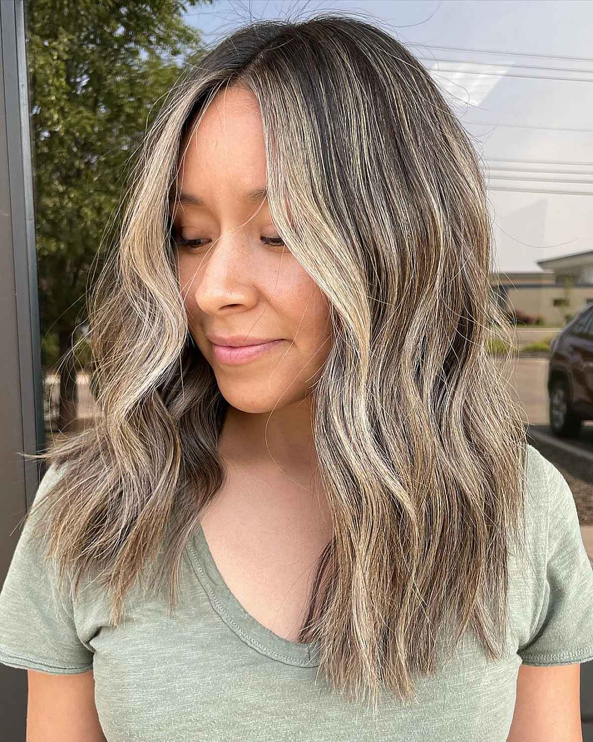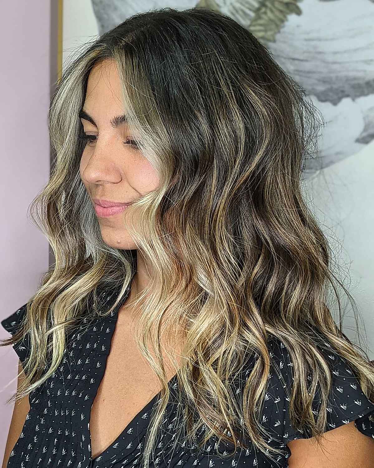 Striking brunette locks with gentle waves is a wonderful way to enhance your hairstyle. Additionally, incorporating a few lighter strands subtly shining through the length. Money pieces should appear effortless, giving the impression that the sun has naturally lightened the sections around your face. Steer clear of heavy or bulky face framing by utilizing a blend of slices, weaves, and teasey lights.