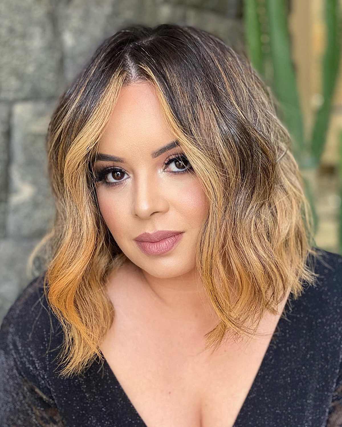 If you’re considering a fresh look with short hair and balayage, try a collarbone-length bob. Short hairstyles that fall below the chin are stunning for round-face shapes. Request honey or caramel-toned highlights from your stylist if your hair is naturally dark and you have a warm complexion.