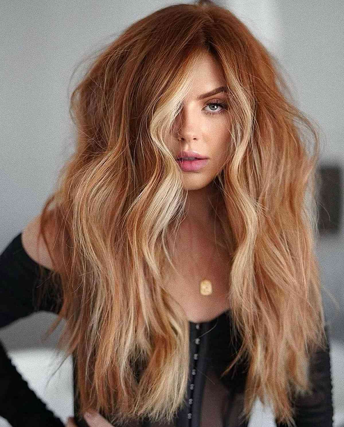A coppery long voluminous hairstyle with a blonde money piece may be just what you’re dreaming of! If you are looking for some layers around your face, ask for some face-framing layers. This color and cut combo will leave everyone in awe.