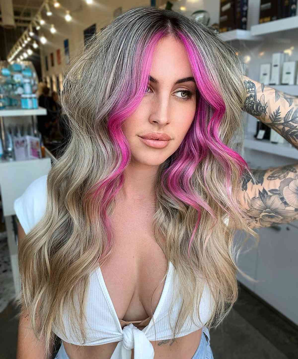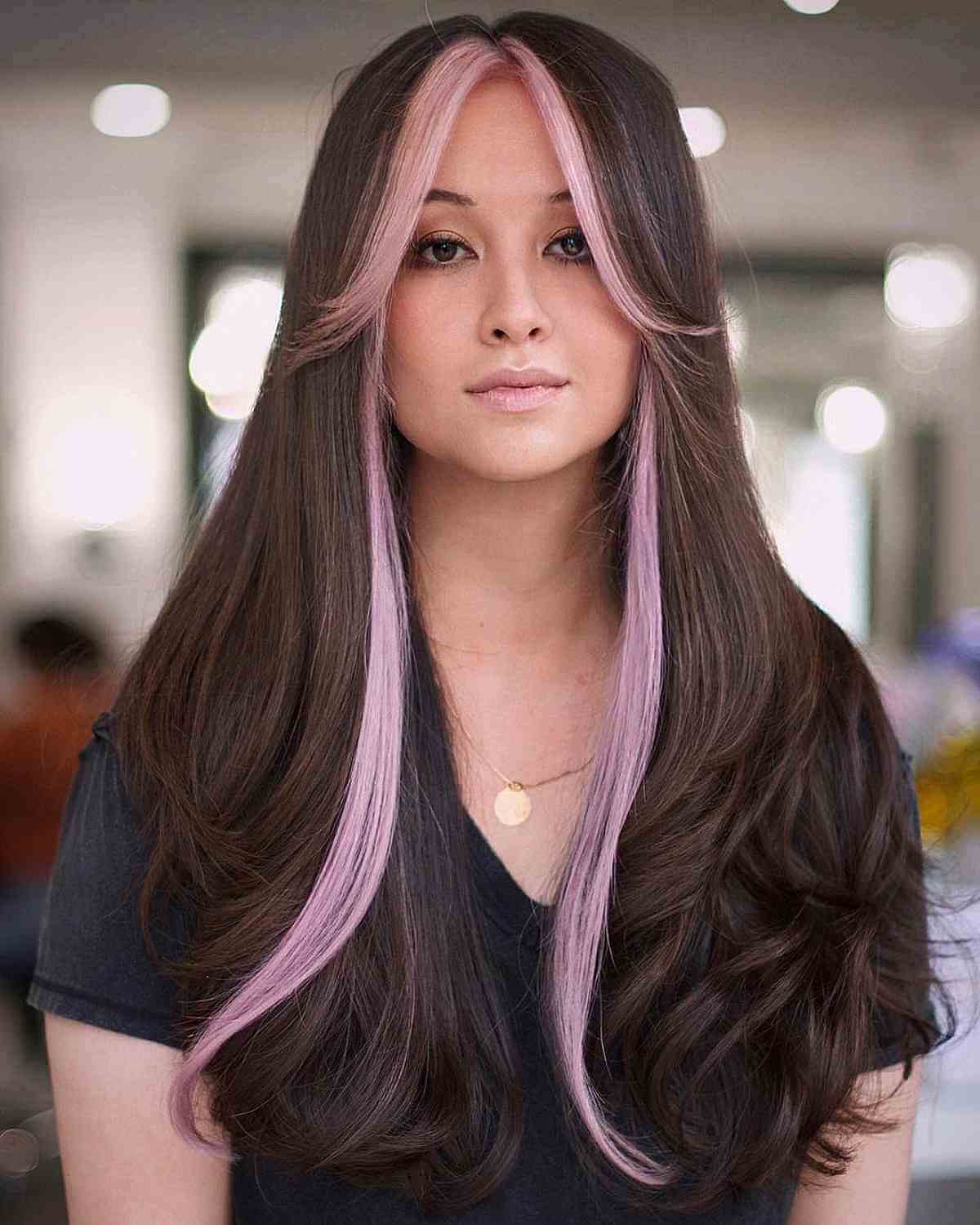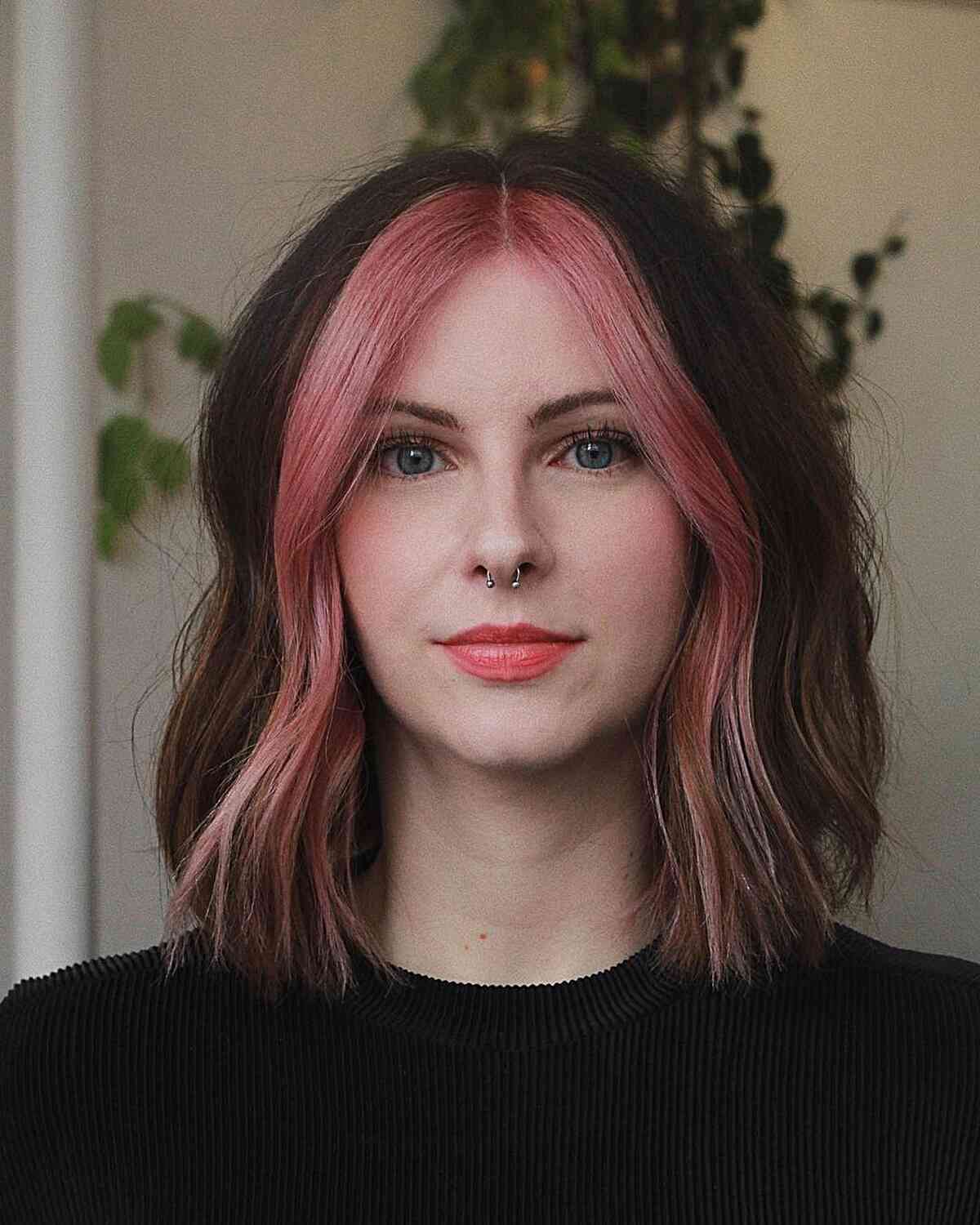 Consider a pink highlight if you want to introduce a gentle pop of color to your hair without coloring the entire look. This hair color trend has a splash of pink hair color around the face-framing pieces. It creates a beautiful contrast against your natural hair tone. But be aware that pink is a light shade that will fade quickly. It works best for women with an oval face as it highlights your best features. Try to achieve the ideal pink by asking your colorist to blend a pastel pink tone with a hint of peach. It will result in a soft and feminine look.