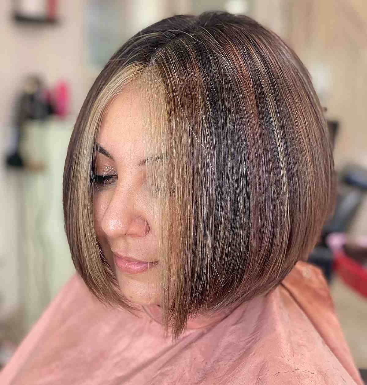 Elegant brown locks with a money piece beautifully frame the face. Women with dark hair looking for effortless lightening hairstyles should always request a bright streak that enhances their features.