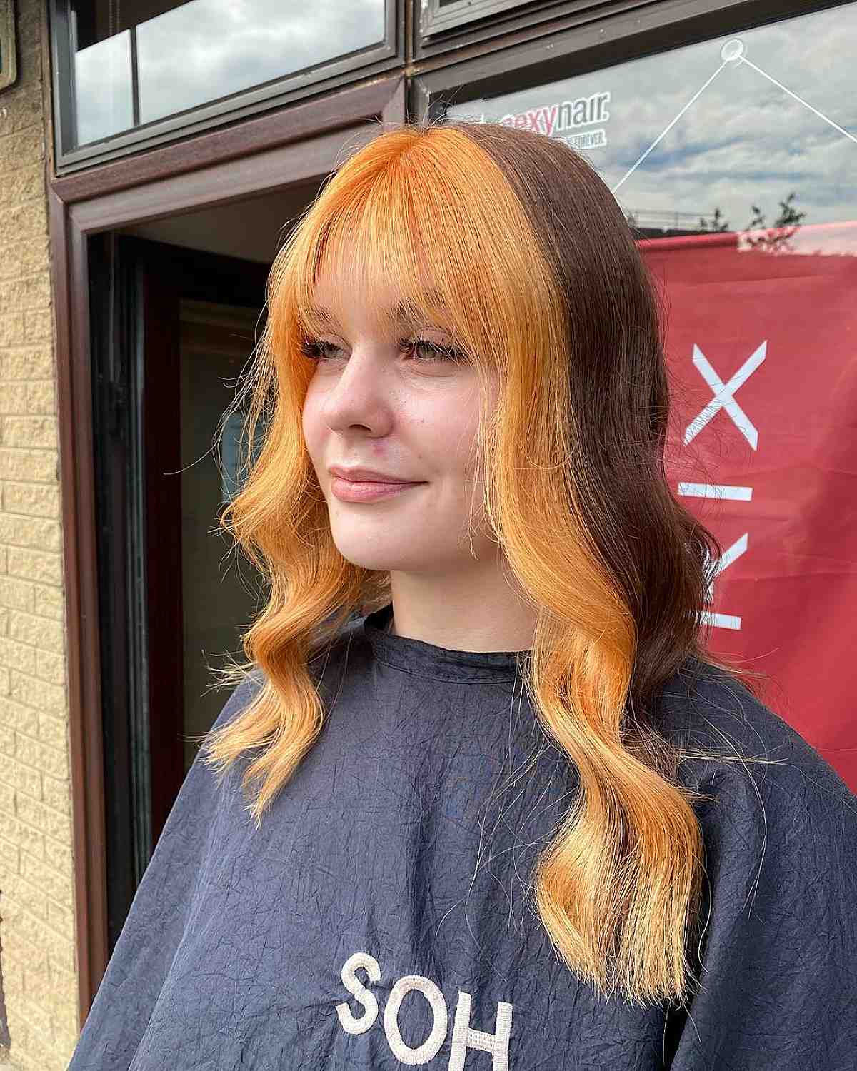 Money pieces are currently in vogue. Nothing captures attention quite like a peach contrast paired with a deep brunette. It’s essential to achieve a perfect, even lift to a level 9 before applying the peach tone. This ensures a consistent shade throughout. While some may achieve this in a single session, it might require a few visits if the client has previously colored hair. This style will appear stunning, whether sleek or with soft waves for a variety of looks!