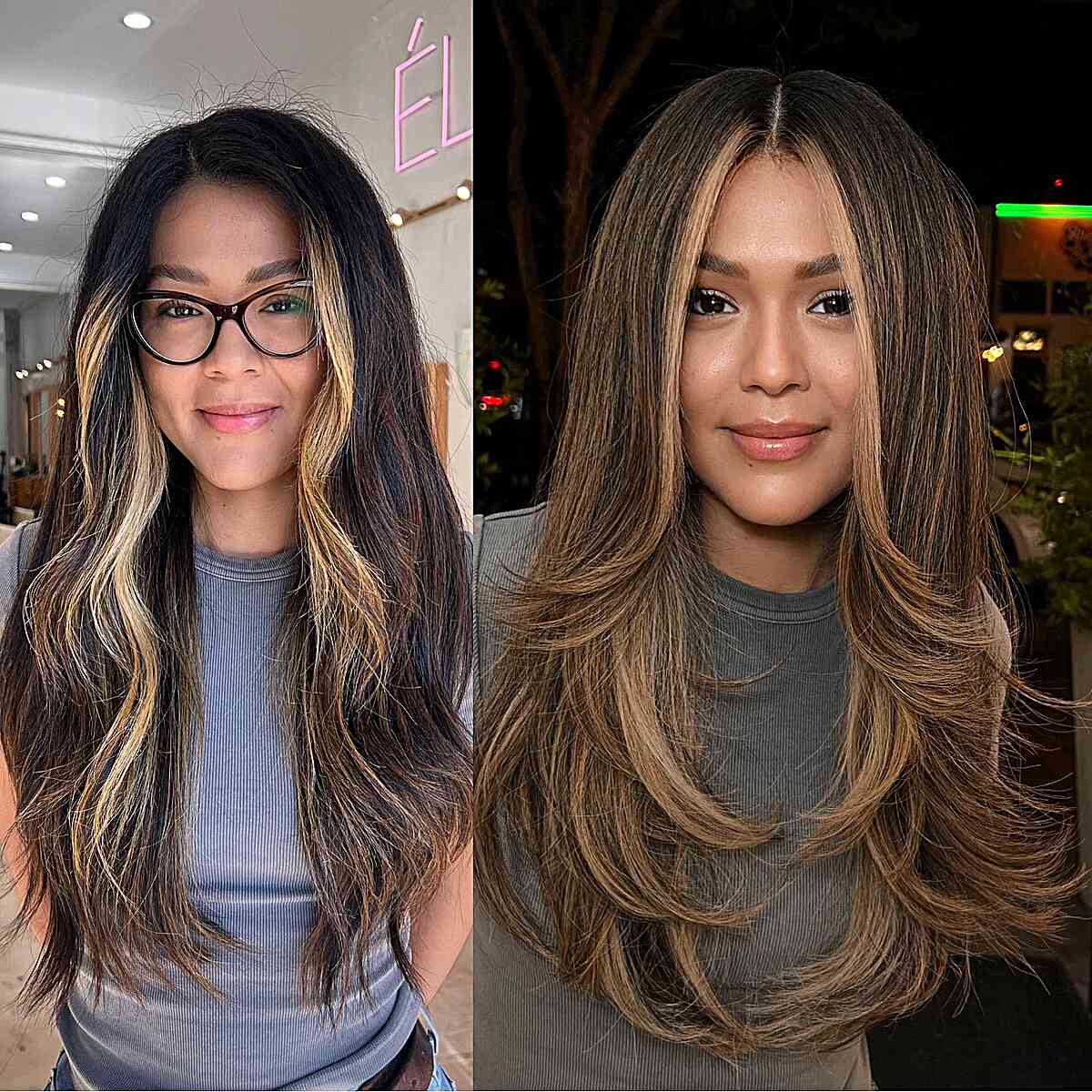 Consider a medium-length, easy-care face frame if you enjoy the appearance of high-contrast color, but dislike the maintenance that two-toned hair often demands. You can add a few free-handed highlights towards the ends of your hair to establish lighter dimensions in your dark locks, but steer clear of overdoing it, or it might quickly start to present a different look. Style your hair in gentle waves or curls to truly complement this dimensional, texture-rich hairstyle.