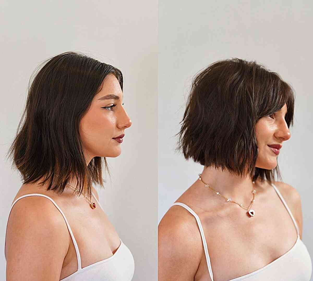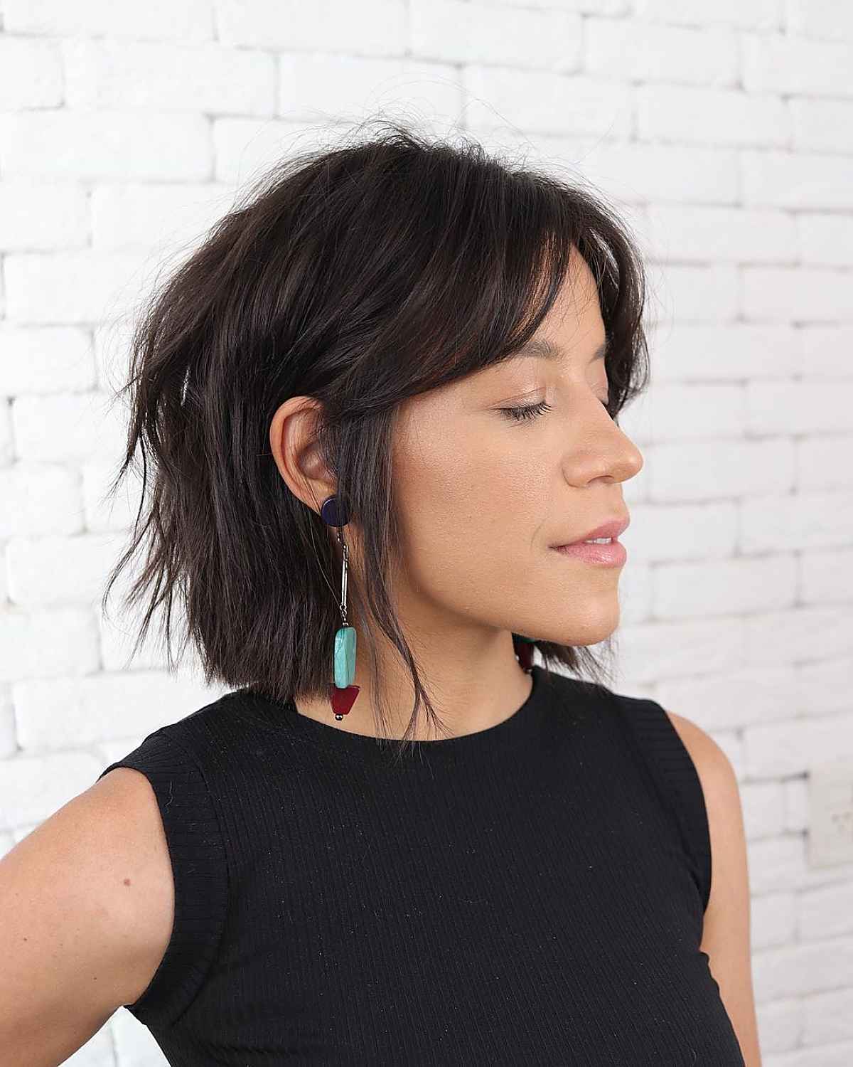 A blunt bob with delicate bangs creates a stylish shag aesthetic. A bob looks fantastic at any length, but consider adjusting the length slightly above or slightly below the shoulders to prevent any flipping of your hair ends.